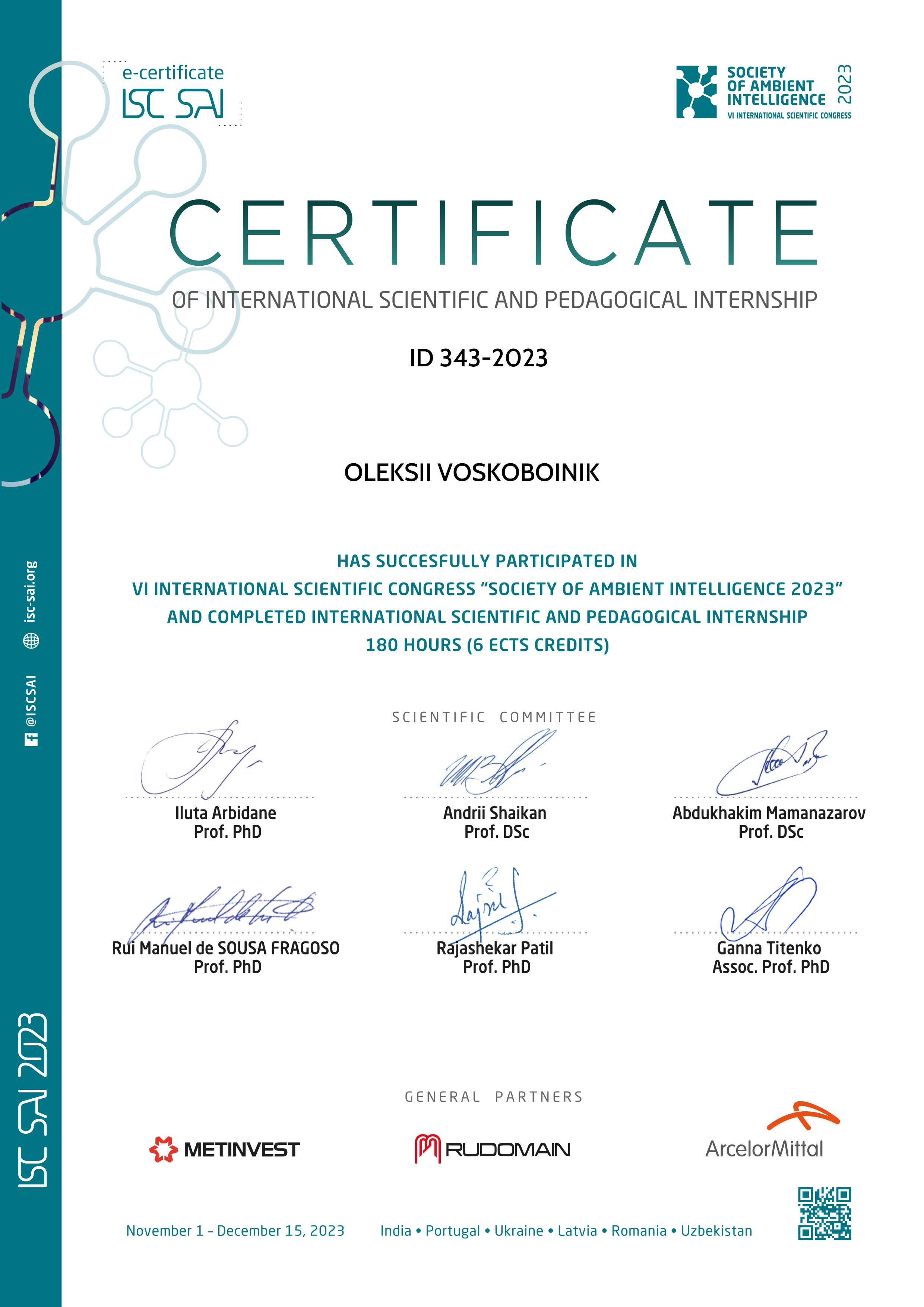 Професор кафедри "Композиційні матеріали, хімія та технології" Олексій ВОСКОБОЙНІК пройшов науково-педагогічне стажування, що проводилось в рамках 7 міжнародного наукового конгресу “SOCIETY OF AMBIENT INTELLIGENCE 2023”