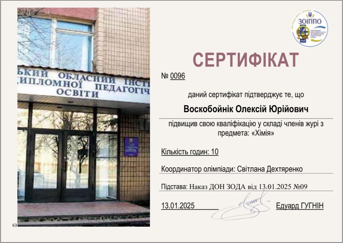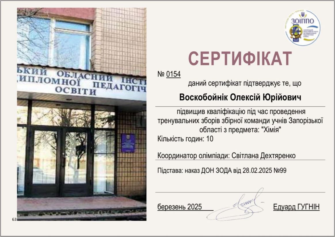 Професор Воскобойнік Олексій Юрійович підвищив кваліфікацію під час проведення тренувальних зборів збірної команди учнів Запорізької області з предмета "Хімія" та у складі членів журі з предмета "Хімія"