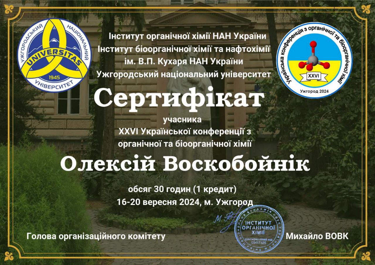 Професор кафедри "Композиційні матеріали, хімія та технології" Олексій ВОСКОБОЙНІК приймав участь у роботі XXVII Української конференції з органічної та біоорганічної хімії.