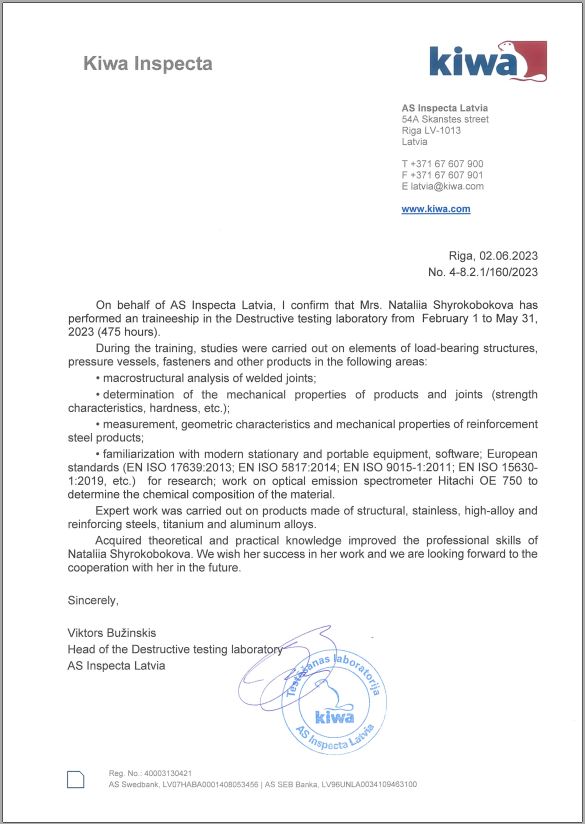 2023 р. – підвищення кваліфікації (міжнародне стажування) «Kiwa Inspecta» за темою «Сучасні методи контролю», «AS Inspecta Latvia», м. Рига, Латвія (475 год). Стажування проходило в лабораторії руйнівних випробувань, дослідження проводилися на елементах несучих конструкцій, сосудах, що працюють під тиском, кріпленнях та інших виробах по наступним напрямкам: макроструктурний аналіз зварних з'єднань; визначення механічних властивостей виробів і з'єднань (характеристики міцності, твердість тощо); вимірювання, геометричні характеристики та механічні властивості виробів з арматурної сталі; ознайомлення з сучасним стаціонарним та портативним обладнанням, програмним забезпеченням; Європейськими стандартами (EN ISO 17639:2013; EN ISO 5817:2014; EN ISO 9015-1:2011; EN ISO 15630-1:2019, та інш.) для дослідження; робота на оптико-емісійному спектрометрі Hitachi OE 750 для визначення хімічного складу матеріалу;