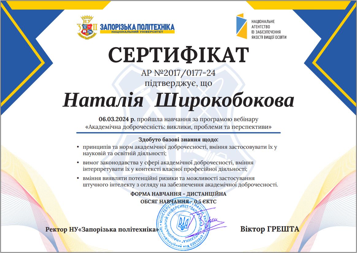 2024 р. – Всеукраїнський форум «Академічна доброчесність: виклики, проблеми та перспективи», м. Запоріжжя (15 год).