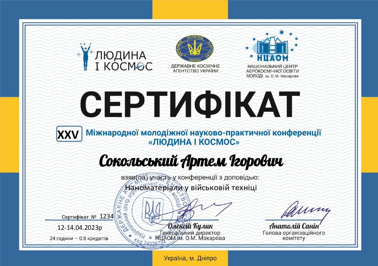 Сокольский Артем Ігорович, студент гр. БАД-219 у 2023 році за найкращу доповідь на ХХV міжнародній науково-практичній конференції «Людина і космос» (м.Дніпро) він був нагороджений дипломом.