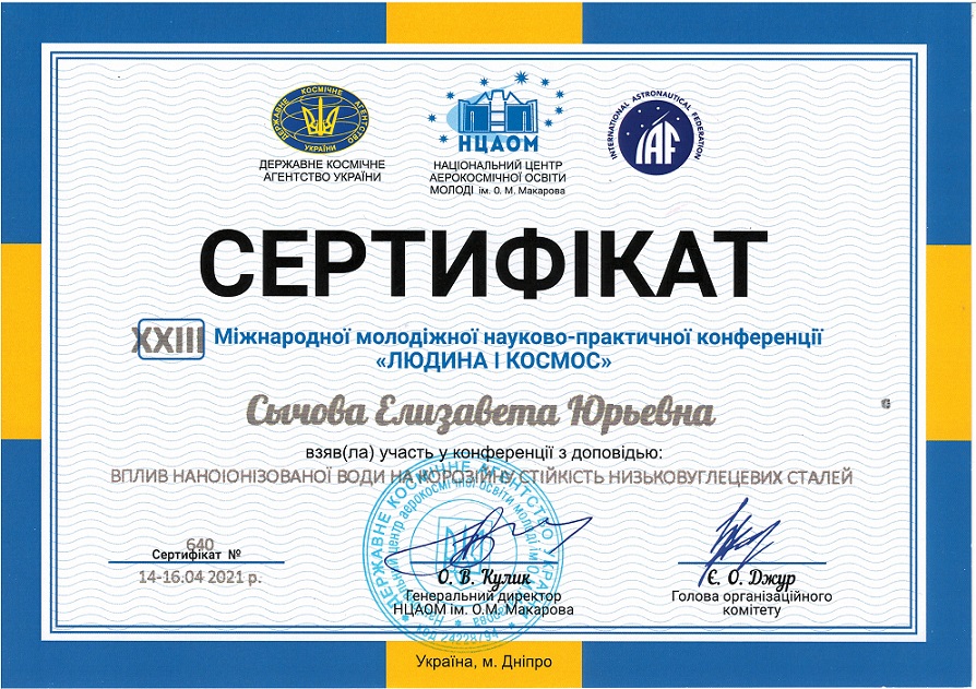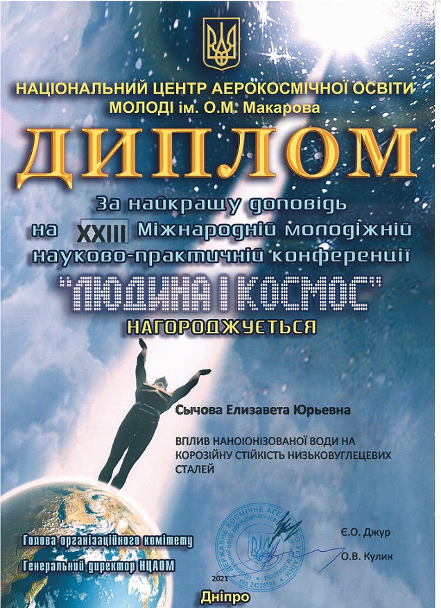 Сичова Єлізавета Юріївна, студентка гр. БАД-218 у 2021 році за найкращу доповідь на ХХІІІ міжнародній науково-практичній конференції «Людина і космос» (м.Дніпро) була нагороджений дипломом.