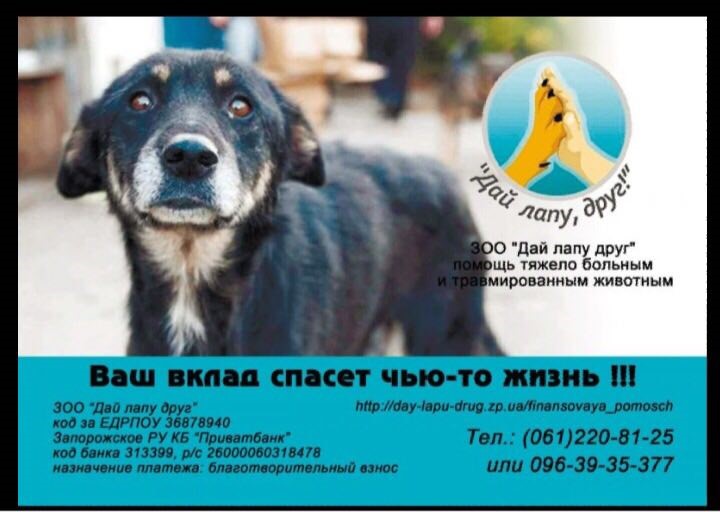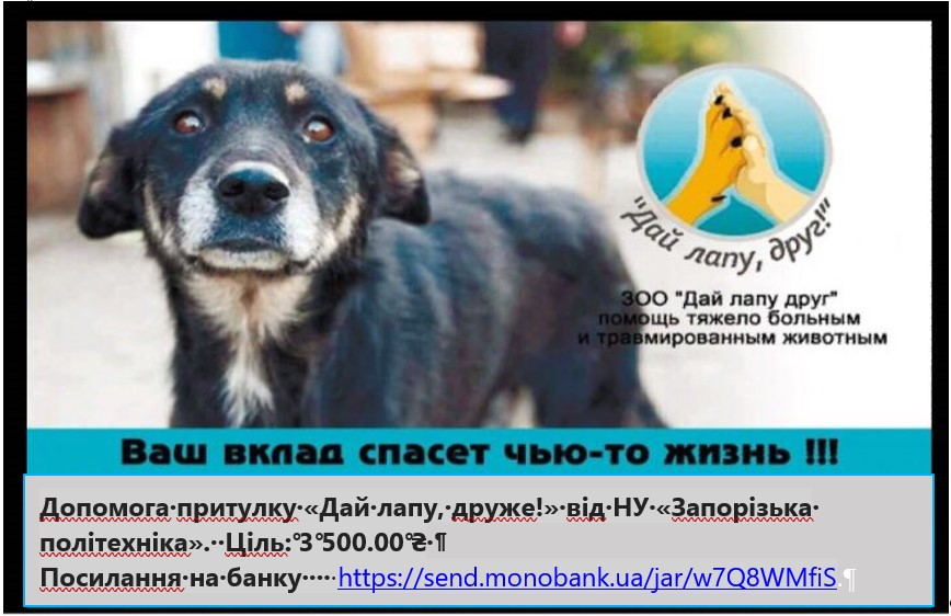 В період з 1.11.24 до 30.11.24 р. стартує чергова благодійна акція «Допомога притулку «Дай лапу, друже!», метою якої є сприяння утриманню безпритульних тварин. Під час сильних обстрілів у Запоріжжі тварини отримали значні поранення та шок у притулку «Дай лапу, друже!»
