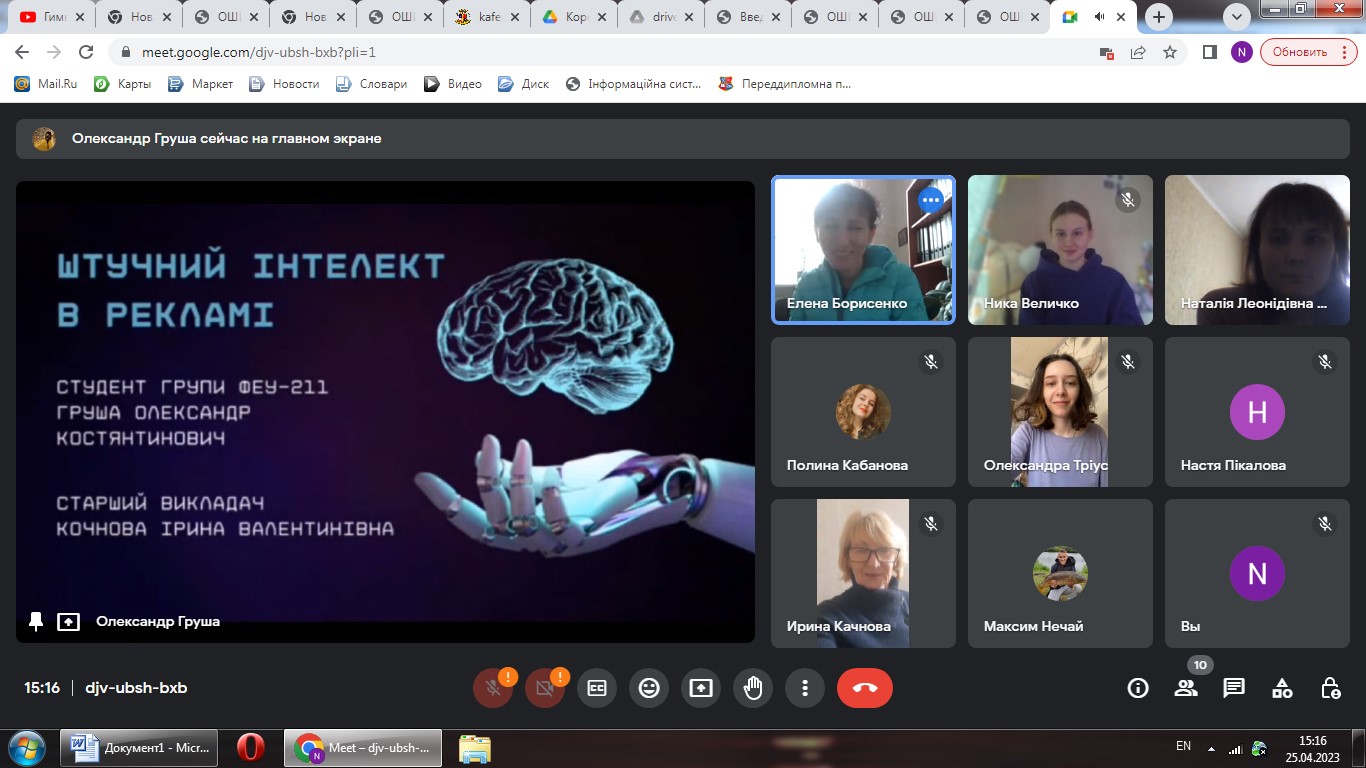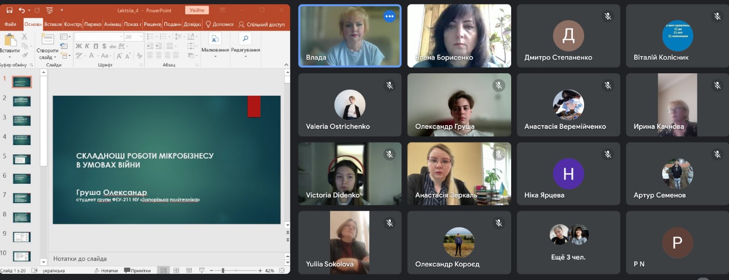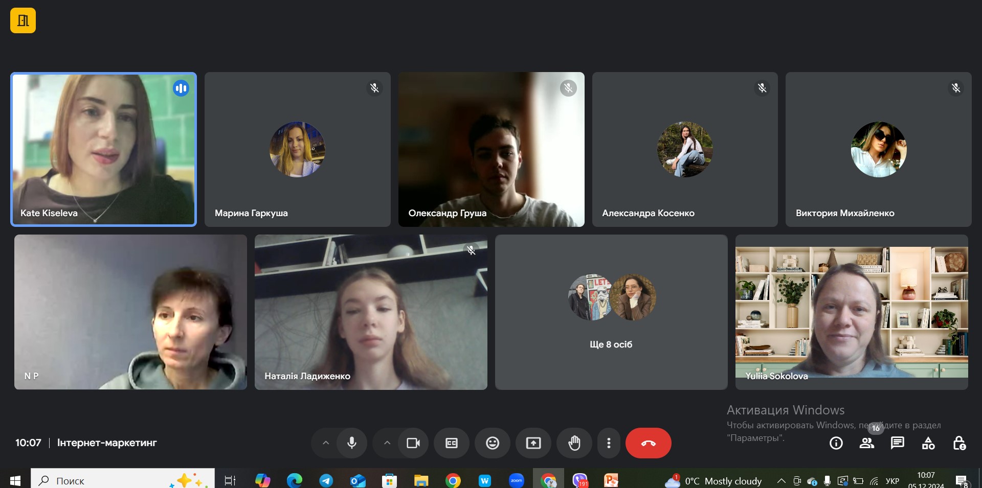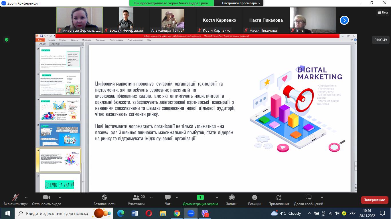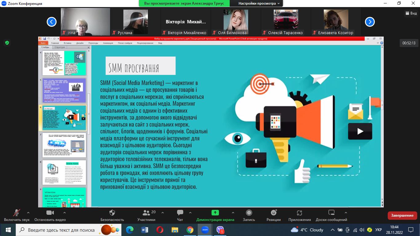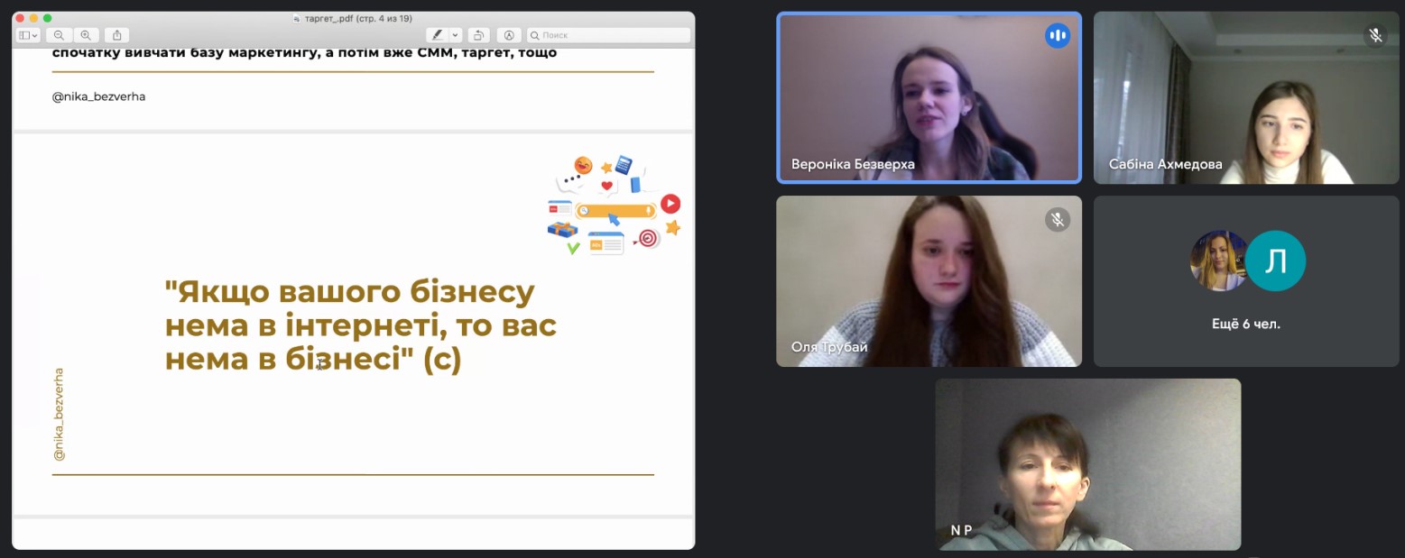 Коротка екскурсія у світ професії була настільки захоплюючою що вийшла далеко за межі однієї пари. Пані Ніка не просто розказала про ази професії чи ті можливості які вона надає для роботи, розвитку та заробітку. Вона поділилась професійними секретами, розповіла про тонкощі налаштування реклами на різних платформах, про підводні камені рекламування та дала порати як їх обійти. Як практик, доповідач розказала, що є важливим ще до початку роботи із клієнтом та чітко виділила «червоні кнопки» на які слід звернути увагу. Ці поради стануть корисними майбутнім фахівцям. На завершення зустрічі пані Ніка наголосила на актуальності роботи у сфері СММ-маркетингу саме під час війни та роботи в умовах онлайн та окреслила основні тренди у сій сфері. Її основна рекомендація – вірити у себе, не боятись перешкод, постійно розвиватись та підтримувати дружні зв’язки із колегами та замовниками.