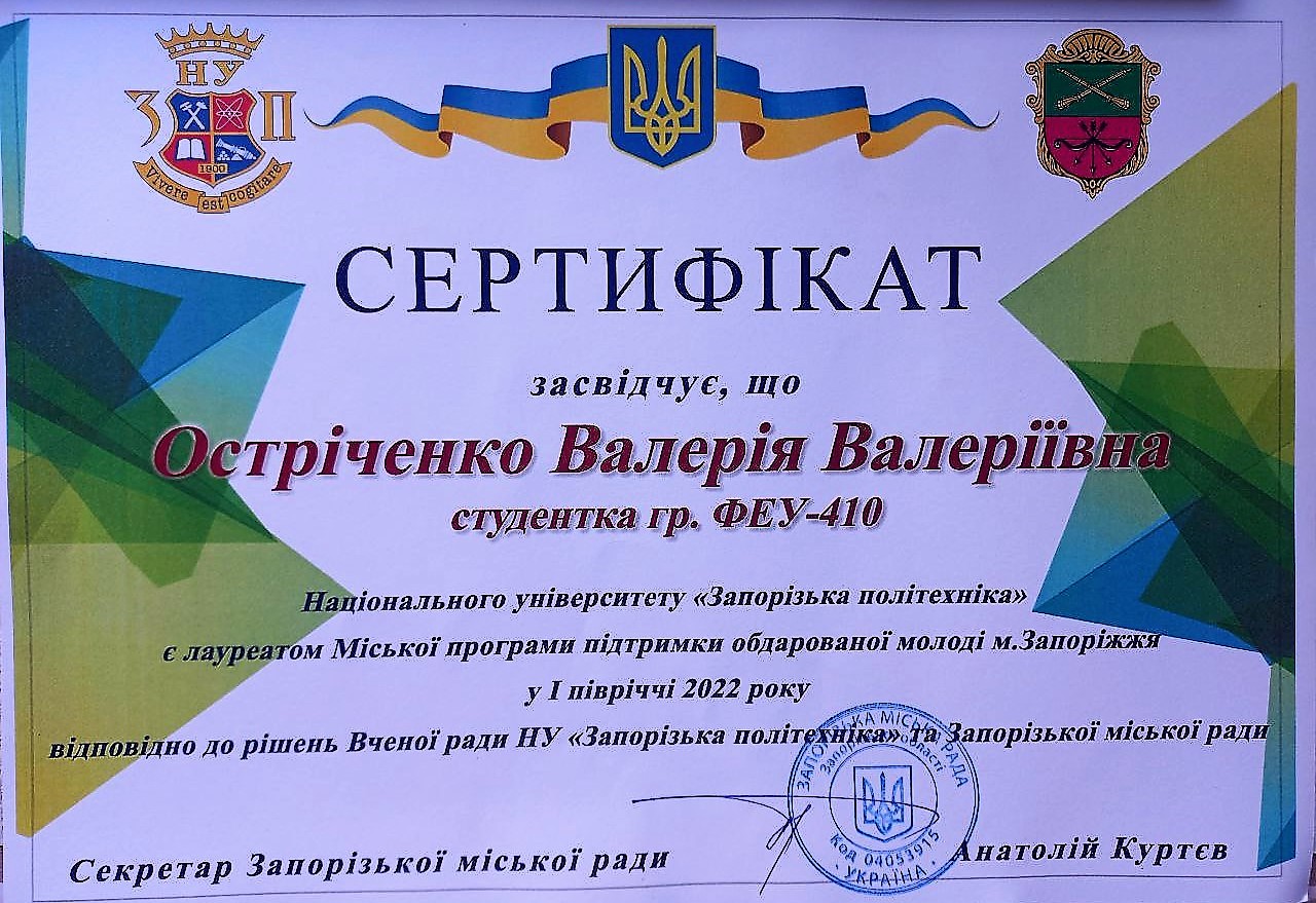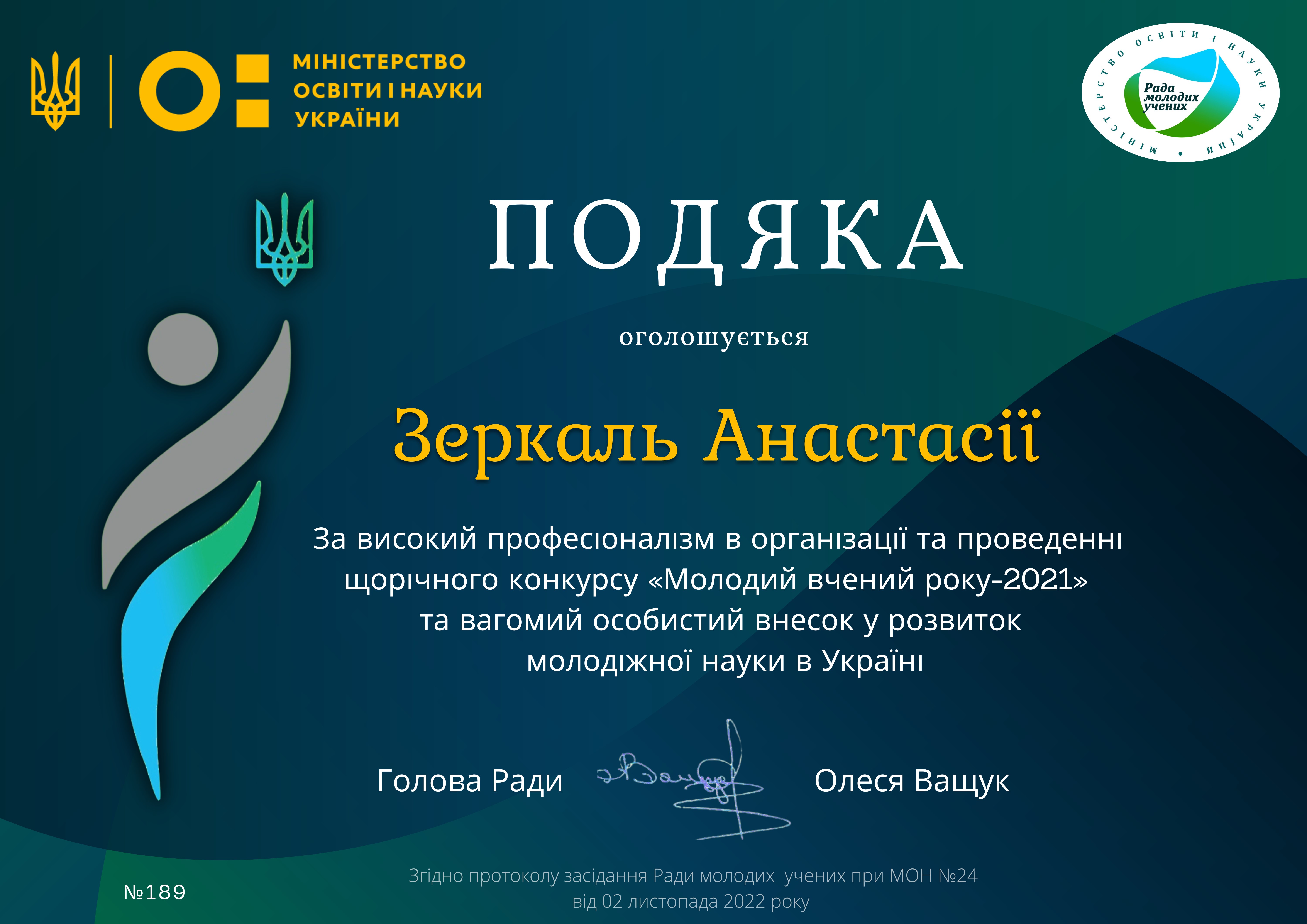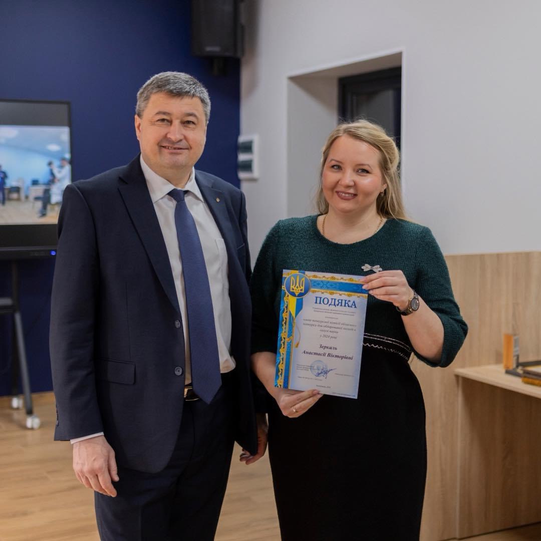 В урочистій обстановці Подяку від Управління молоді, фізичної культури та спорту Запорізької ОДА отримала професор кафедри «Маркетинг та логістика» Анастасія Зеркаль за участь в експертній комісії Обласного конкурсу обдарованої молоді в галузі науки.
