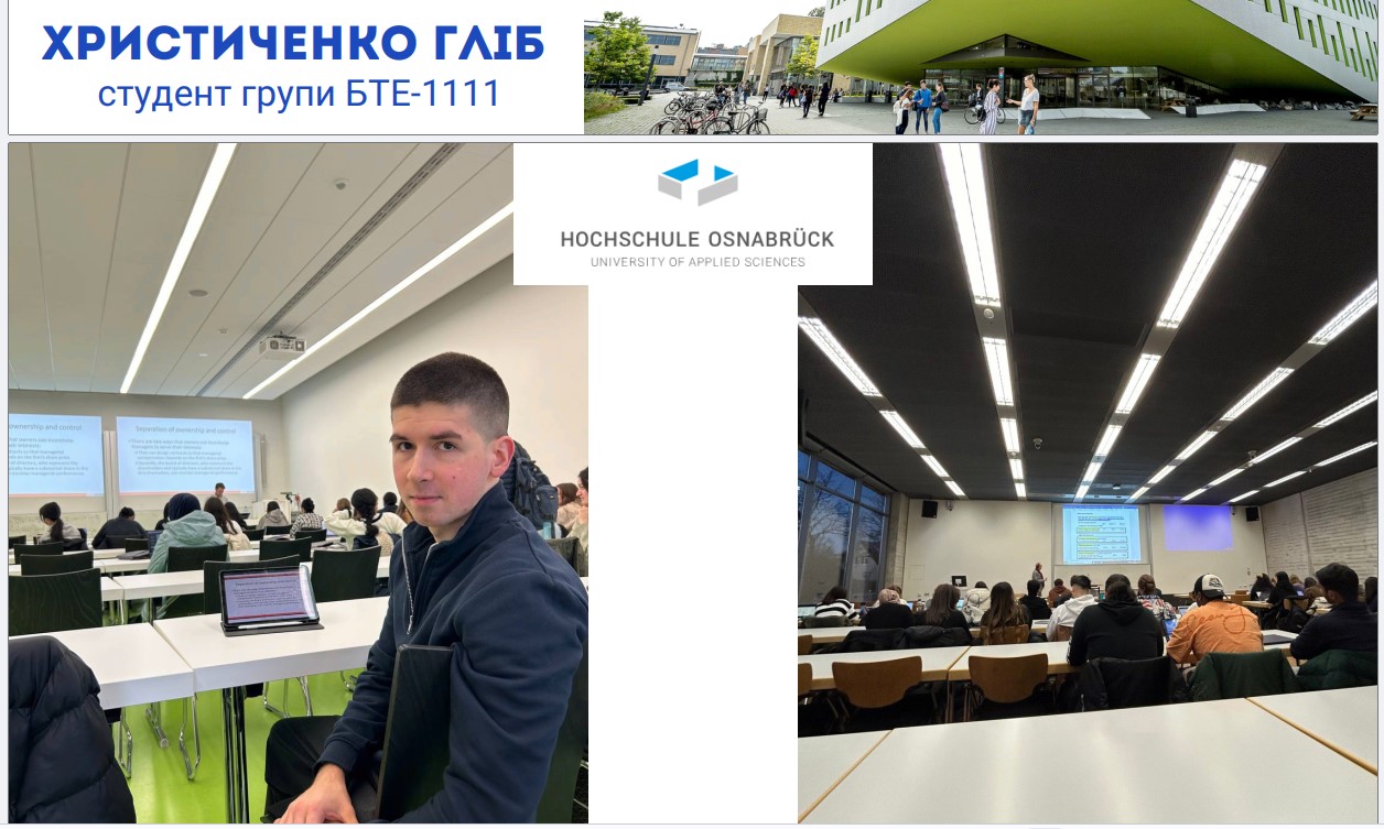 Одним з доповідачів цієї конференції став студент групи БТЕ-1111 Гліб Христиченко, який розповів про свій досвід навчання за програмою академічної мобільності та вивчення дисциплін спеціальності «Міжнародне управління» на факультеті бізнес-управління та соціальних наук найбільшого університету прикладних наук у Нижній Саксонії (Німеччина) – Університеті прикладних наук Оснабрюка (з вересня 2022 по серпень 2023 року). Гліб розповів про відмінності європейської системи освіти, що визвало жваву дискусію та багато питань у студентів.