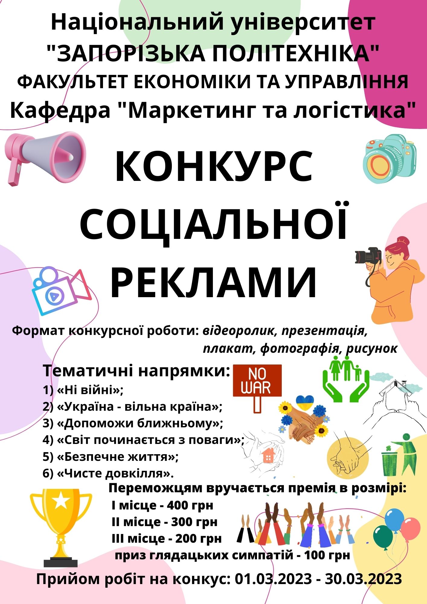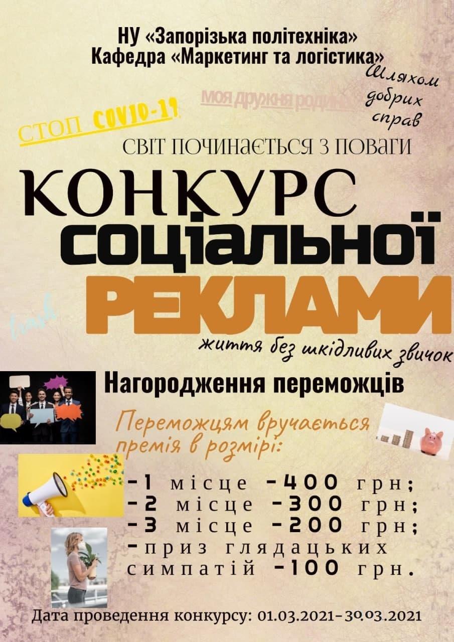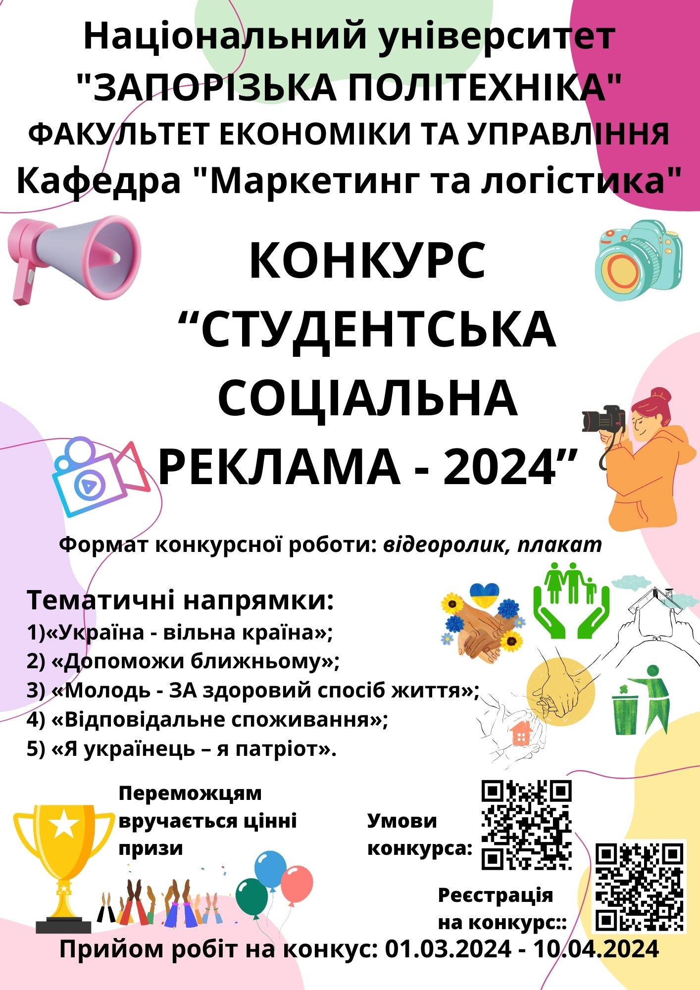 Детальна тематика конкурсних робіт, технічні вимоги, а також критерії оцінки можна дізнатися з Регламенту конкурсу у старост, кураторів, на кафедрі (ауд. 281) та сторінці кафедри у facebook: goo.gl/E5VGqm. Конкурсні роботи потрібно надати до 30 березня 2018 р. на кафедру маркетингу та логістики. Координатор Конкурсу – Антонюк Катерина Іванівна. Сьогодні у студентської молоді з'являється все більше можливостей для розкриття свого творчого потенціалу і розвитку необхідних навичок для самореалізації. Конкурс дає можливість кожному студенту продемонструвати свій талант в жанрі рекламного повідомлення, реалізувавши творчі здібності в області соціальної реклами.