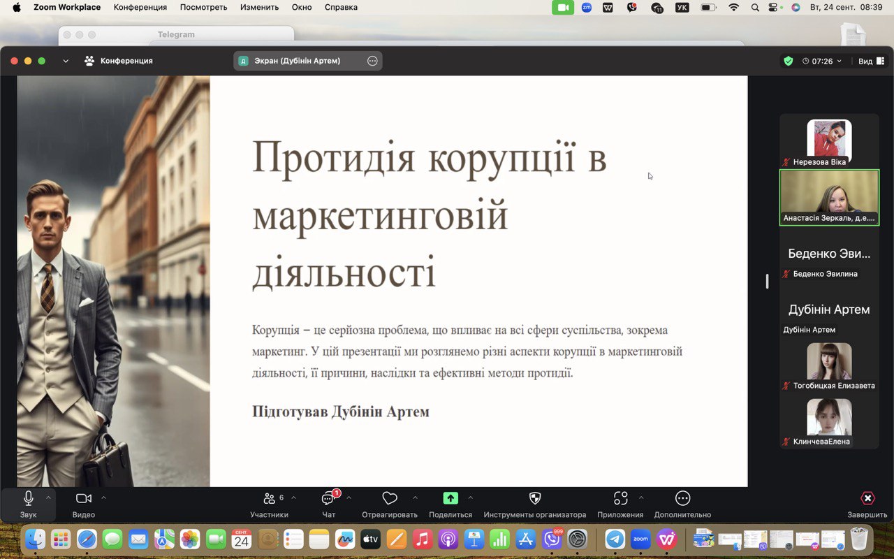 24 вересня 2024 року в межах діяльності студентського наукового гуртка кафедри маркетингу та логістики "Я – маркетолог. Я – логіст." відбулося засідання на тему "Шляхи подолання ризиків недоброчесності та корупції в професії маркетолога". На заході студенти та викладачі обговорили актуальні проблеми етики в маркетинговій діяльності, механізми запобігання недоброчесній поведінці та корупційним практикам у сфері маркетингу.