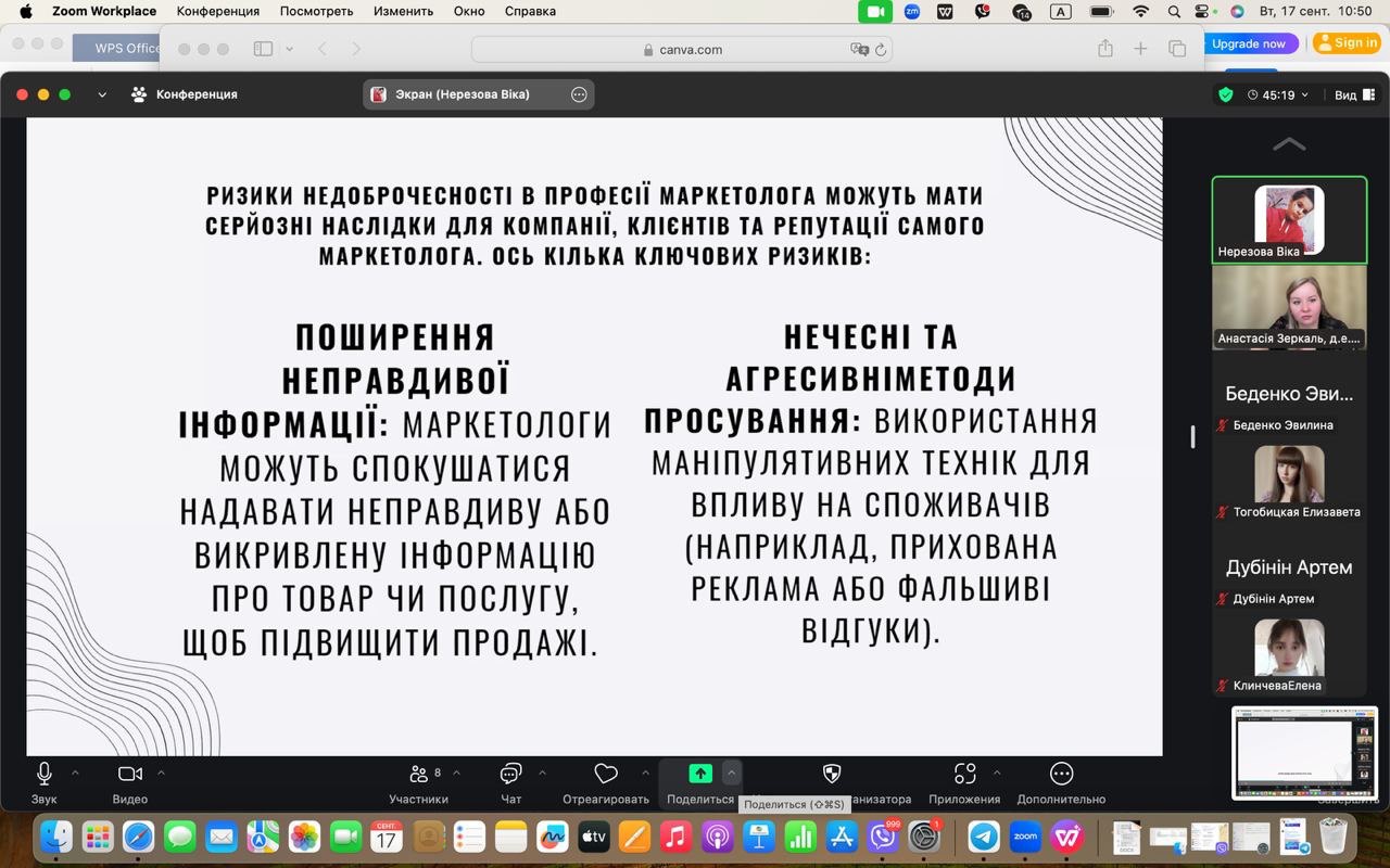 Засідання гуртка завершилося жвавою дискусією, під час якої студенти пропонували власні ідеї щодо підвищення етичних стандартів у маркетинговій діяльності, а також обговорювали можливі шляхи реалізації таких ініціатив у майбутній професійній діяльності.