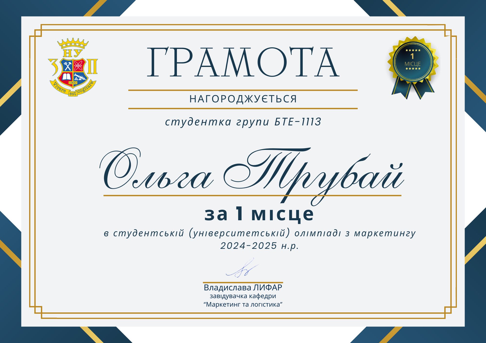 ІІ місце за напрямом «Маркетинг» зайняла робота під шифром «Дитячий маркетинг» («Маркетингова діяльність у сфері організації дозвілля для дітей») автор Ольга Трубай (БТЕ-1113), науковий керівник доц. Павлішина Н.М.