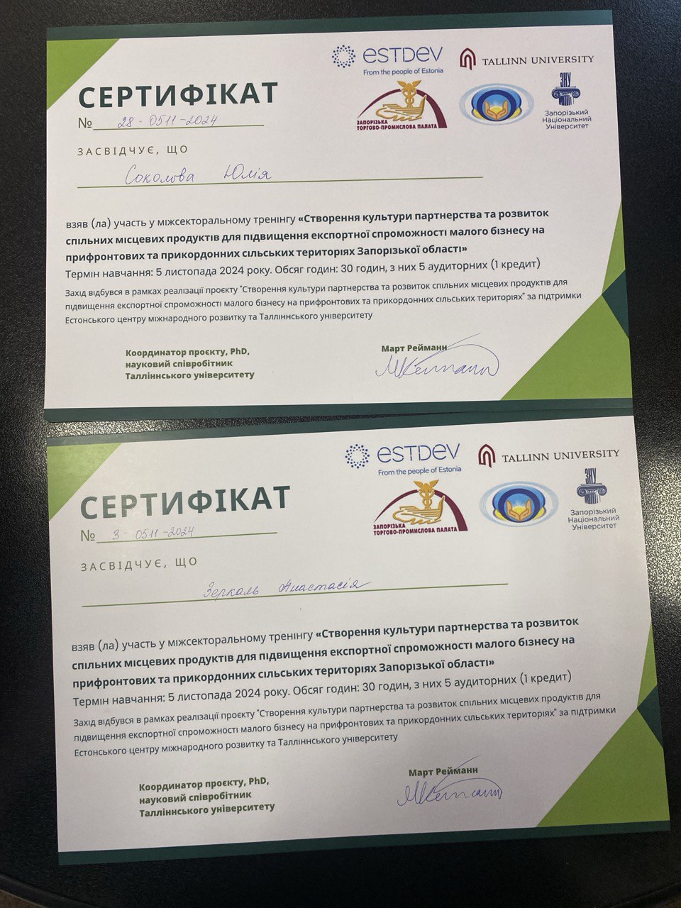 Викладачі кафедри проф. Анастасія ЗЕРКАЛЬ та доц. Юлія СОКОЛОВА взяли участь у роботі Міжсекторального комунікаційного тренінгу «Створення культури партнерства та розвиток спільних місцевих продуктів для підвищення експортної спроможності малого бізнесу на прифронтових та прикордонних сільських територіях Запорізької області». Захід проводиться в межах естонсько-українського проекту «Створення культури партнерства та розвиток спільних місцевих продуктів для підвищення експортної спроможності малого бізнесу на прифронтових та прикордонних сільських територіях» за підтримки Естонського центру міжнародного розвитку та Талліннського університету.