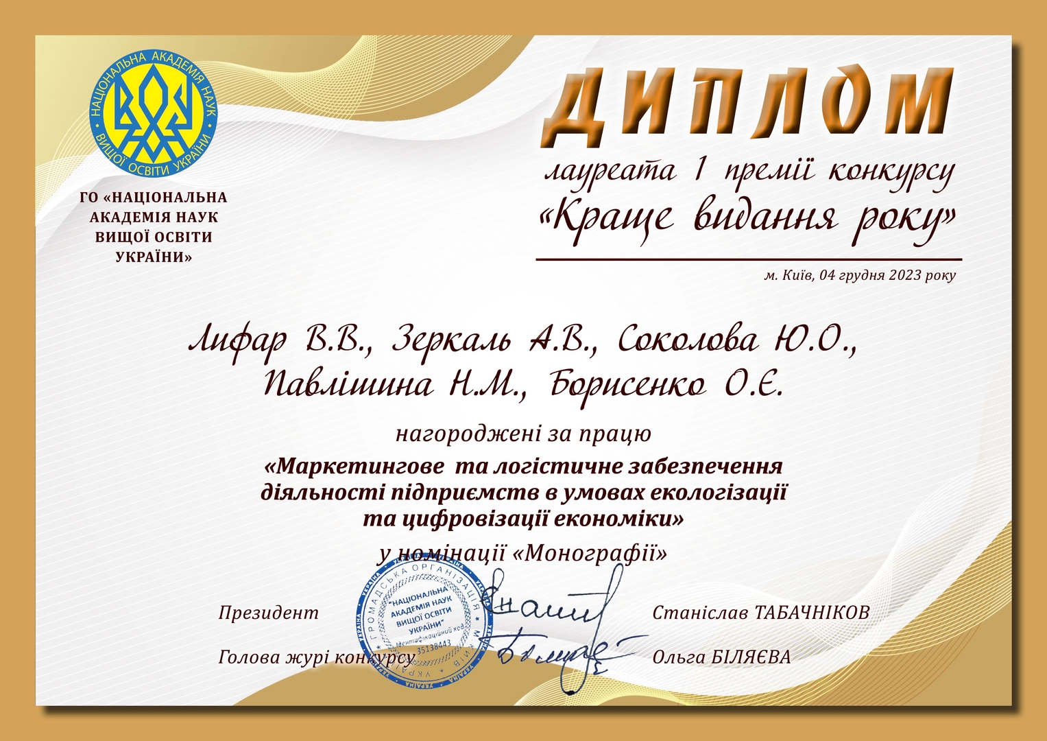 Кафедра маркетингу та логістики у листопаді 2023 р. взяла участь у конкурсі «Краще видання 2023 року», проведеного громадськими організаціями «Національна академія наук вищої освіти України» та «Міжнародна академія освіти і науки».