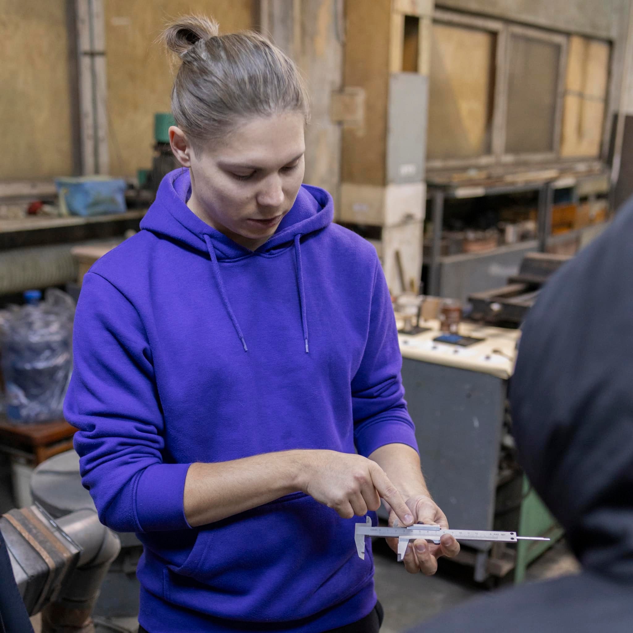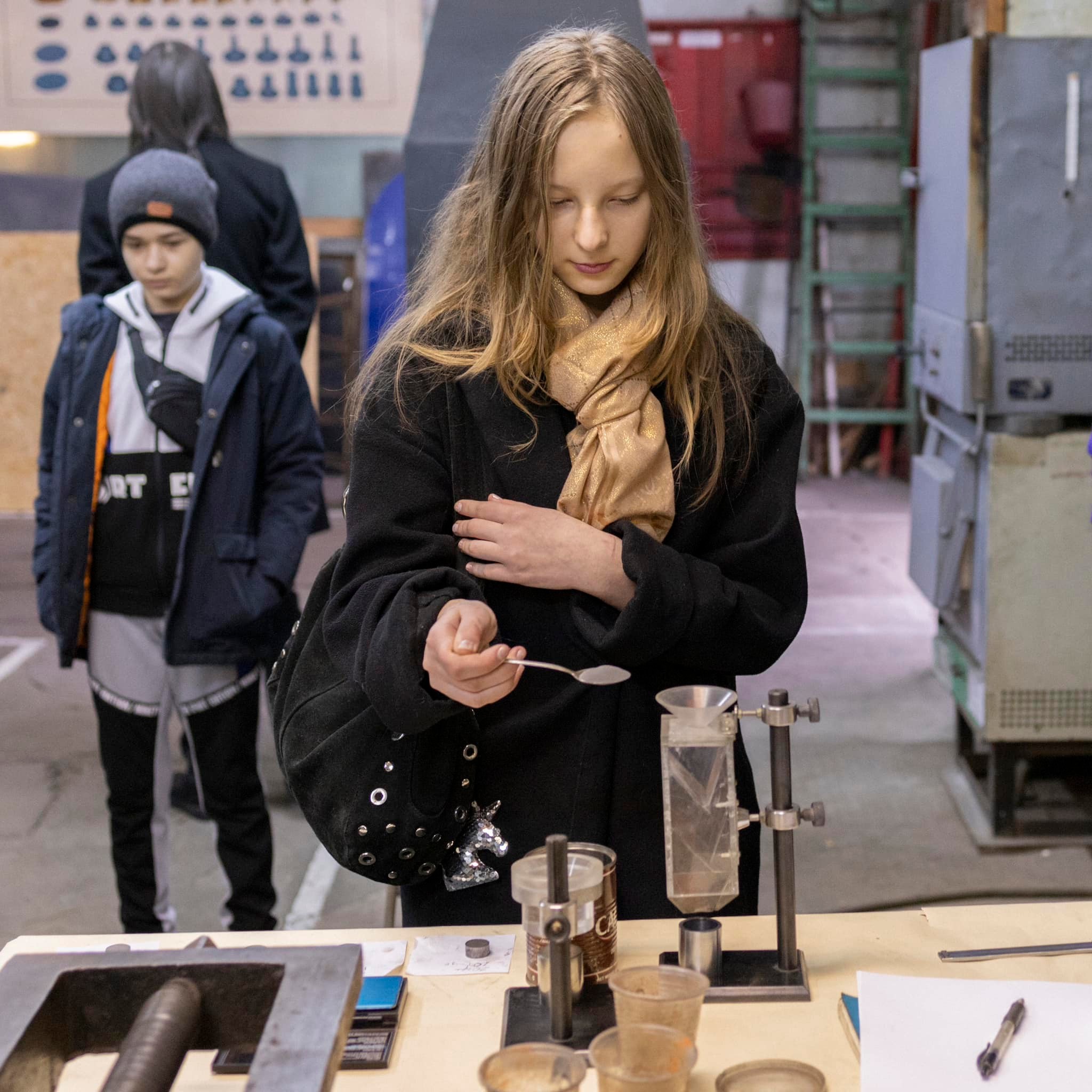 Провели заняття з прикладної механіки та машинобудування для школярів. Учні вчилися користуватися штангенциркулем, розраховувати об'єм фігури та визначати вагу деталі. Також досліджували текучість металевих порошків і виготовляли циліндри під тиском 5, 10 і 15 тонн, аналізуючи зміни їх розмірів.