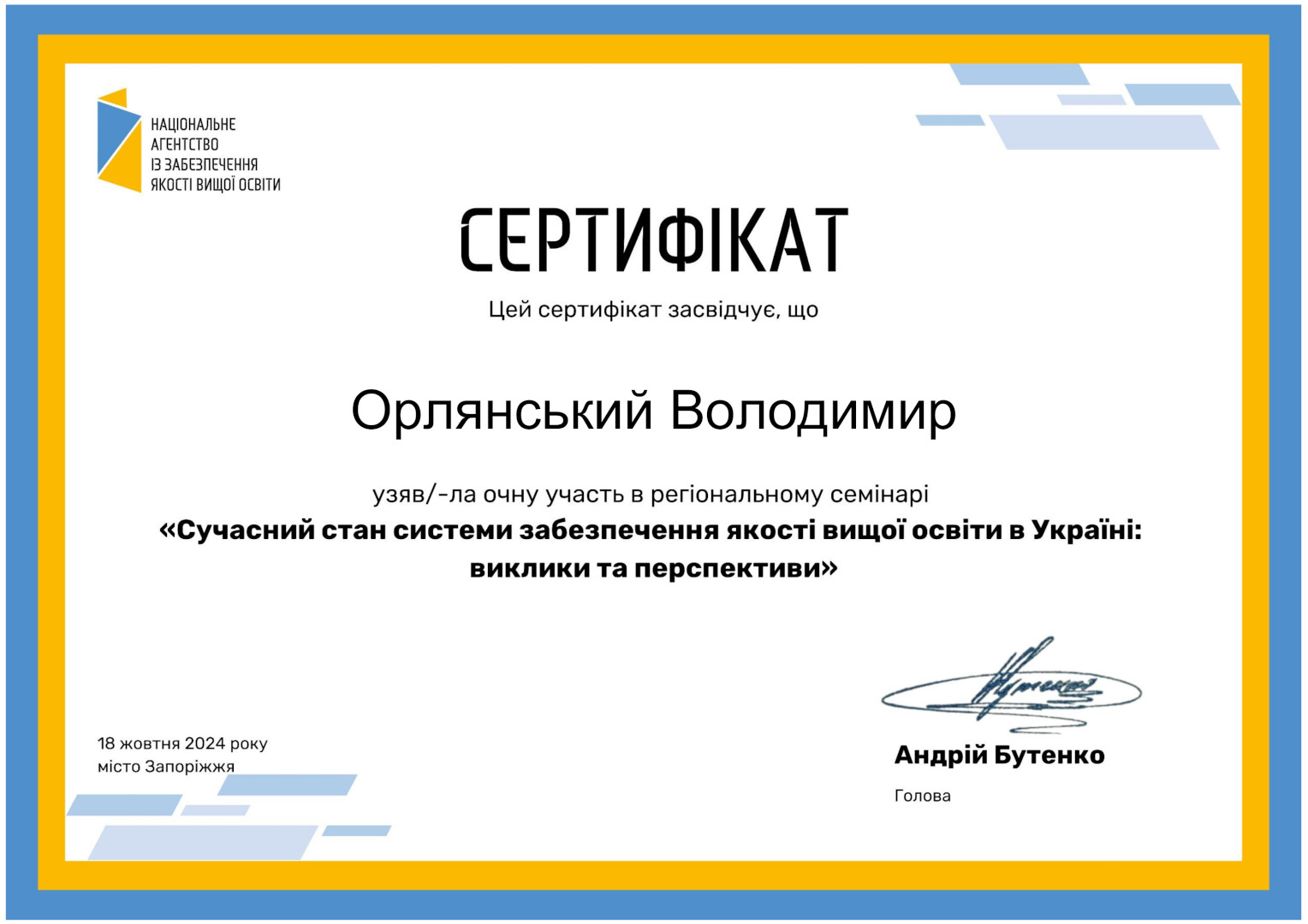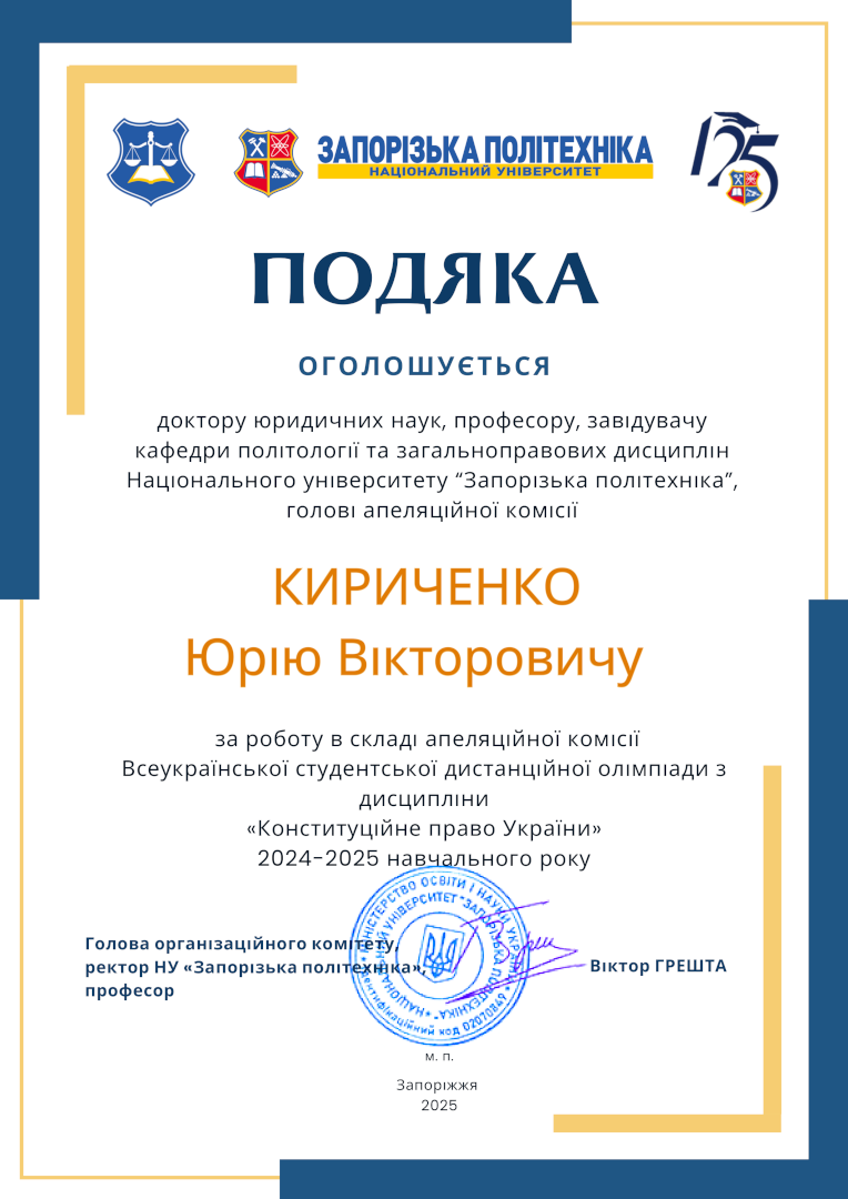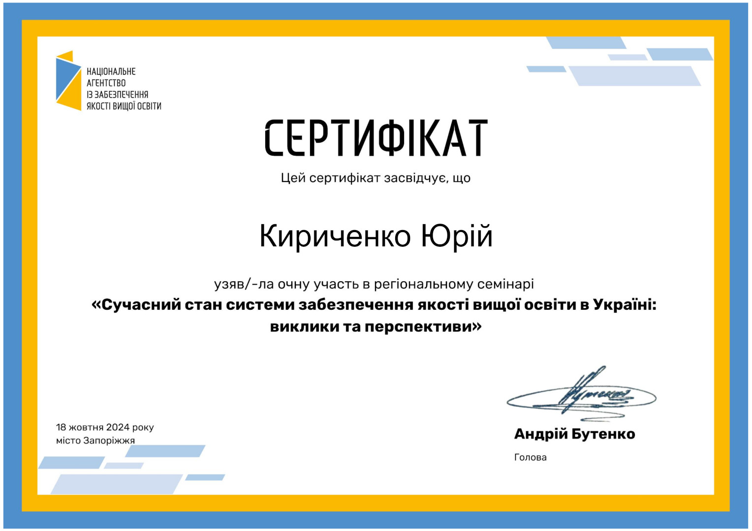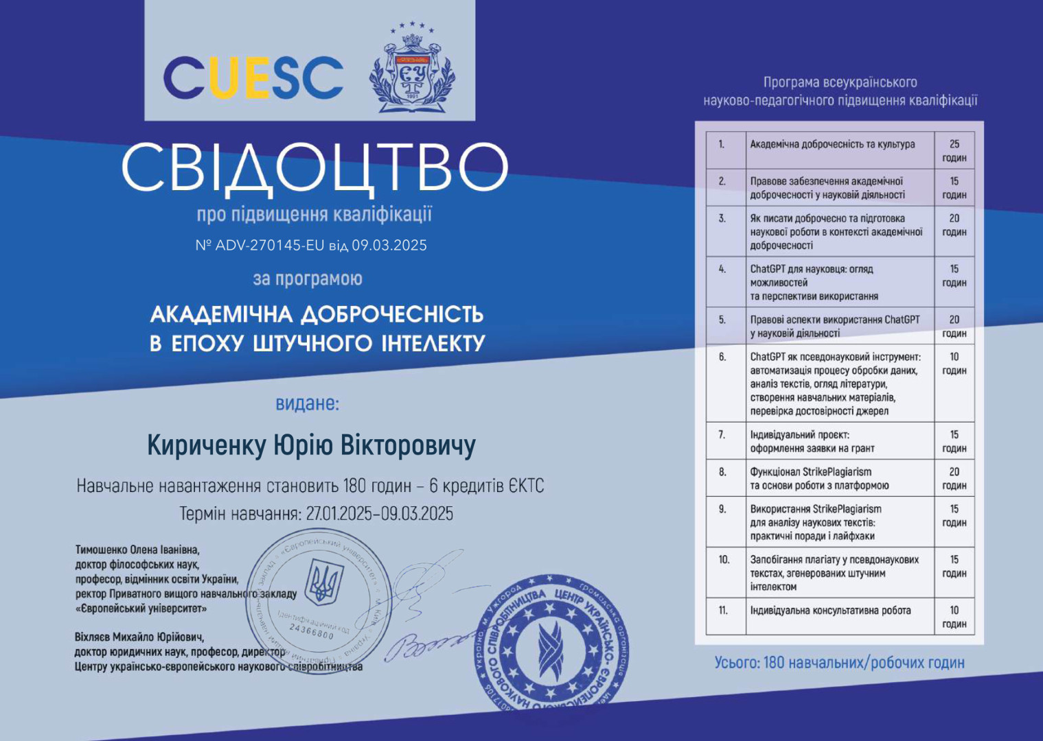 Завідувач кафедри “Політологія та загальноправові дисципліни” Національного університету “Запорізька політехніка”, доктор юридичних наук, професор КИРИЧЕНКО Юрій у період із 27 січня 2025 року по 09 березня 2025 року пройшов всеукраїнське науково-педагогічне підвищення кваліфікації у Приватному вищому навчальному закладі “Європейський університет” на тему: “Академічна доброчесність в епоху штучного інтелекту” (6 кредитів ЄКТС, 180 годин).
