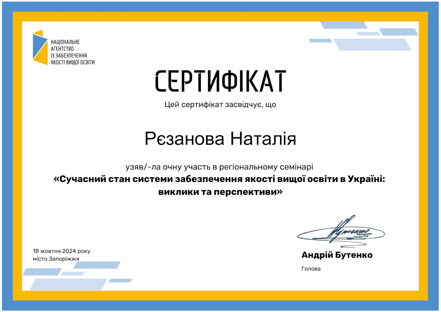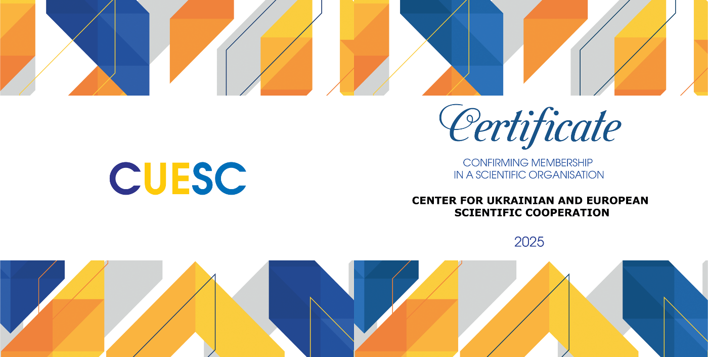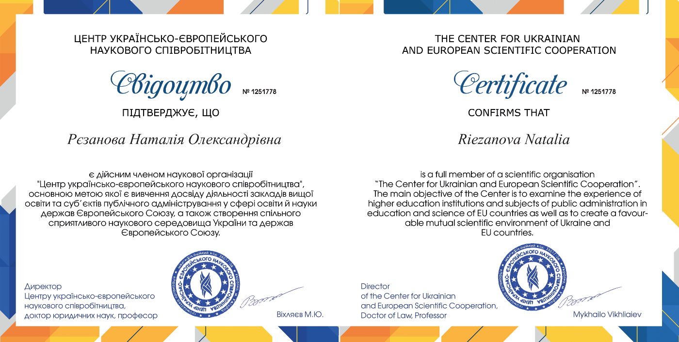 Доцент кафедри “Політологія та загальноправові дисципліни”, кандидат філософських наук, доцент РЄЗАНОВА Наталія отримала свідоцтво, що підтверджує її членство в науковій організації “Центр українсько-європейського наукового співробітництва”, основною метою якої є вивчення досвіду діяльності закладів вищої освіти та суб'єктів публічного адміністрування у сфері освіти й науки держав Європейського Союзу, а також створення спільного сприятливого наукового середовища України та держав Європейського Союзу.