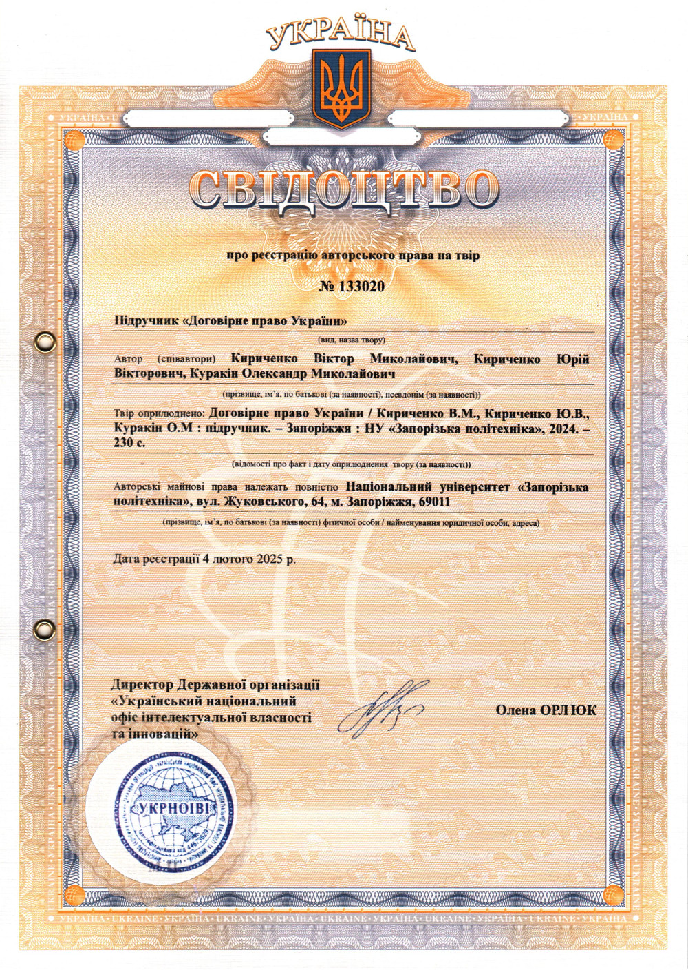 Науково-педагогічні працівники кафедри “Політологія та загальноправові дисципліни” Національного університету “Запорізька політехніка” отримали свідоцтво про реєстрацію авторського права на твір “Підручник “Договірне право України” (Автори: Кириченко В.М., Кириченко Ю.В., Куракін О.М.).