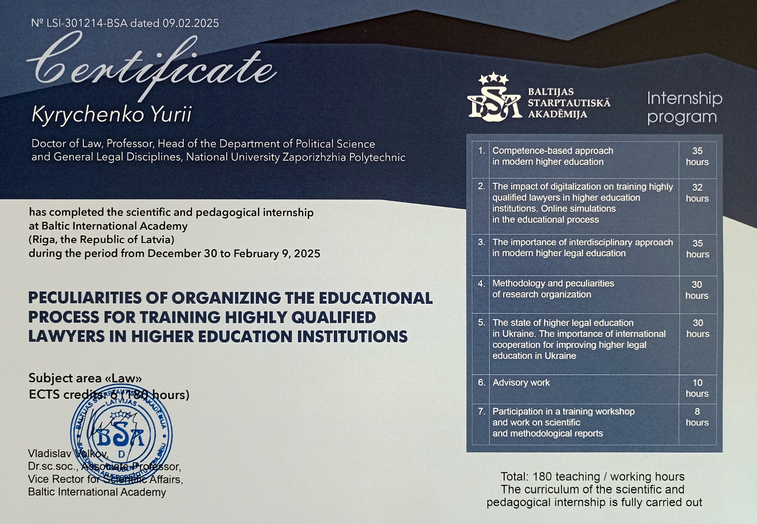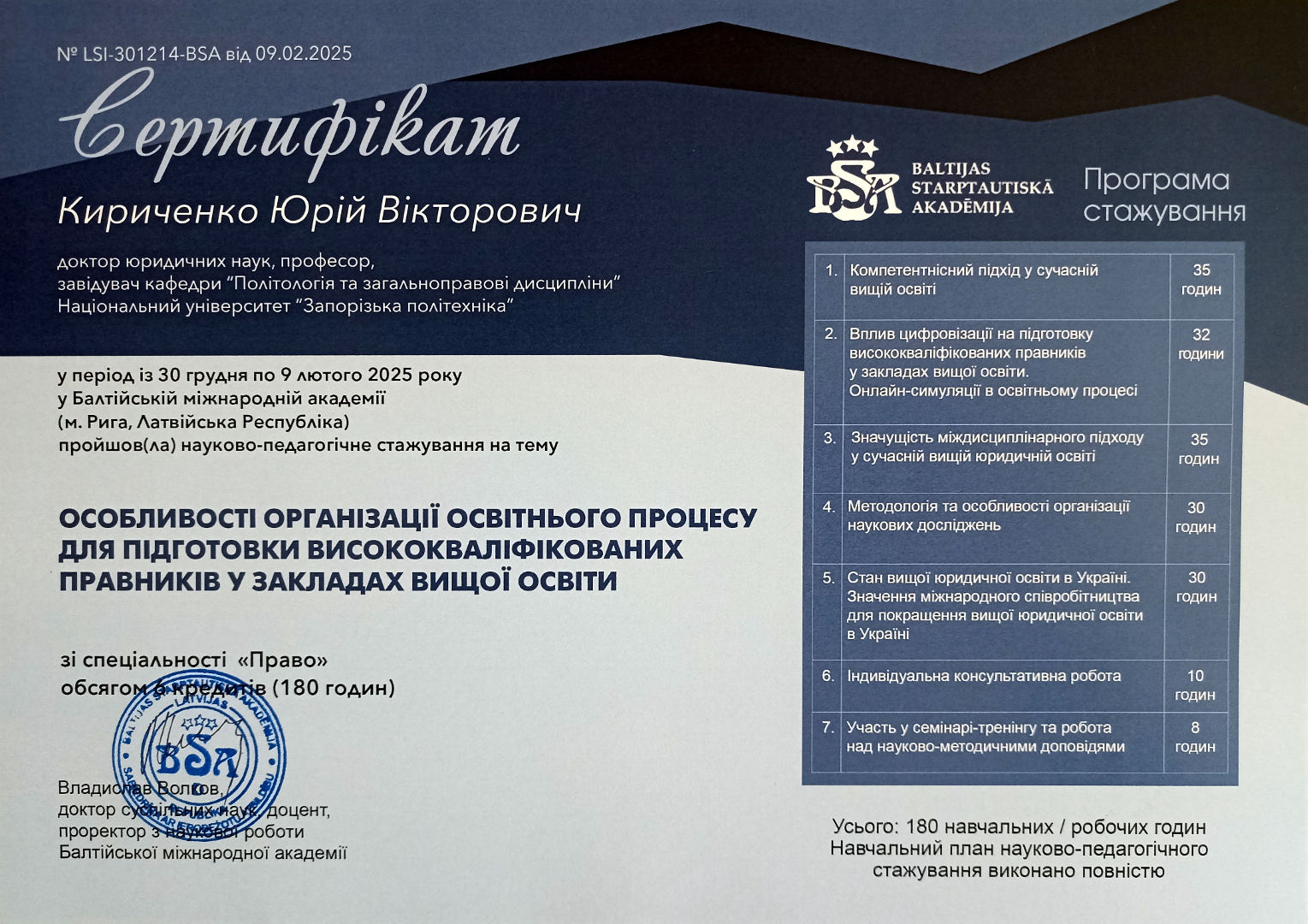 Завідувач кафедри “Політологія та загальноправові дисципліни” Національного університету “Запорізька політехніка”, доктор юридичних наук, професор КИРИЧЕНКО Юрій у період із 30 грудня 2024 року по 09 лютого 2025 року пройшов науково-педагогічне стажування у Балтійській міжнародній академії на тему: “Особливості організації освітнього процесу для підготовки висококваліфікованих правників у закладах вищої освіти” (м. Рига, Латвійська Республіка) (6 кредитів ЄКТС, 180 годин).