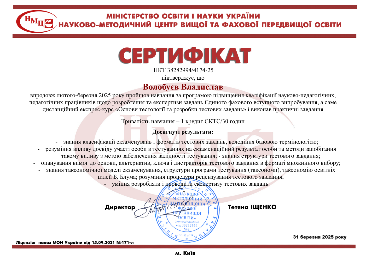 Доцент кафедри “Політологія та загальноправові дисципліни” Національного університету “Запорізька політехніка”, кандидат філософських наук, доцент ВОЛОБУЄВ Владислав впродовж лютого-березня 2025 року пройшов навчання за програмою підвищення кваліфікації науково-педагогічних, педагогічних працівників щодо розроблення та експертизи завдань Єдиного фахового вступного випробування (дистанційний експрес-курс «Основи тестології та розробки тестових завдань») (1 кредит ЄКТС/30 годин).