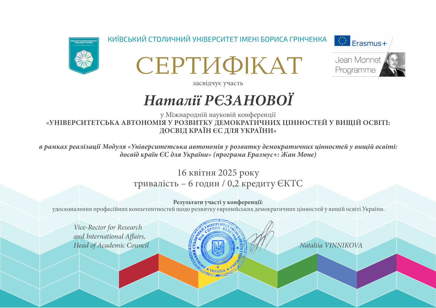 Доцент кафедри “Політологія та загальноправові дисципліни”, кандидат філософських наук, доцент РЄЗАНОВА Наталія взяла участь у Міжнародній науковій конференції на тему: «Університетська автономія у розвитку демократичних цінностей у вищій освіті: досвід країн ЄС для України» (6 годин, 0,2 кредиту ЄКТС), за результатами якої удосконалено професійні компетентності щодо розвитку європейських демократичних цінностей у вищій освіті України.