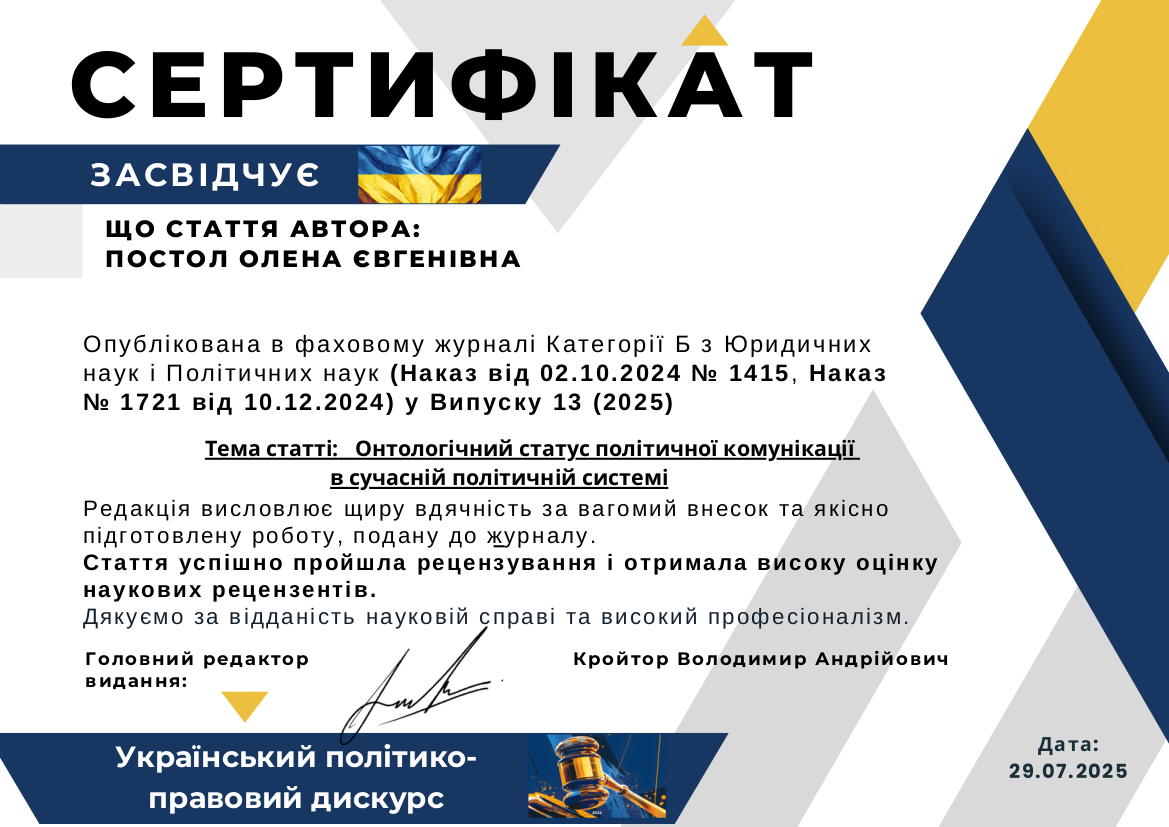 Вітаємо ПОСТОЛ Олену Євгенівну, професора кафедри “Політологія та загальноправові дисципліни” Національного університету “Запорізька політехніка”, доктора політичних наук, доцента з присвоєнням вченого звання професора по кафедрі політології та загальноправових дисциплін. Бажаємо міцного здоров'я, творчої наснаги, професійних та наукових успіхів!