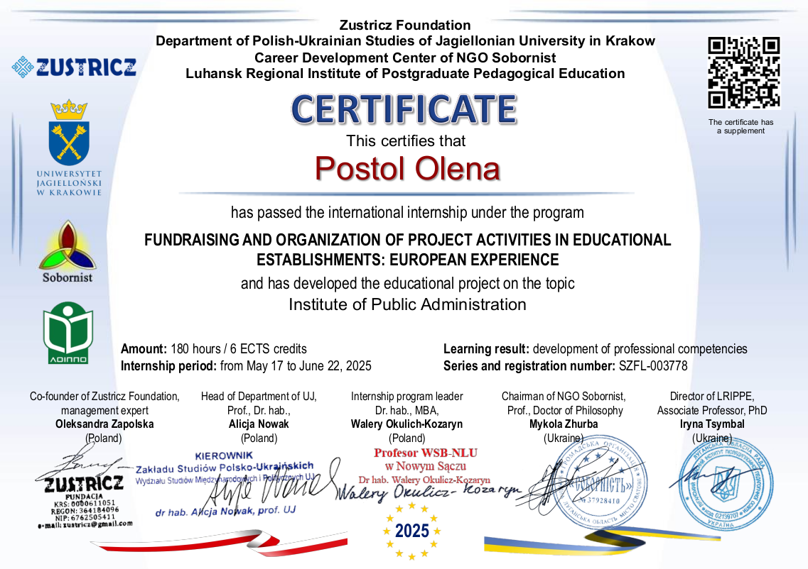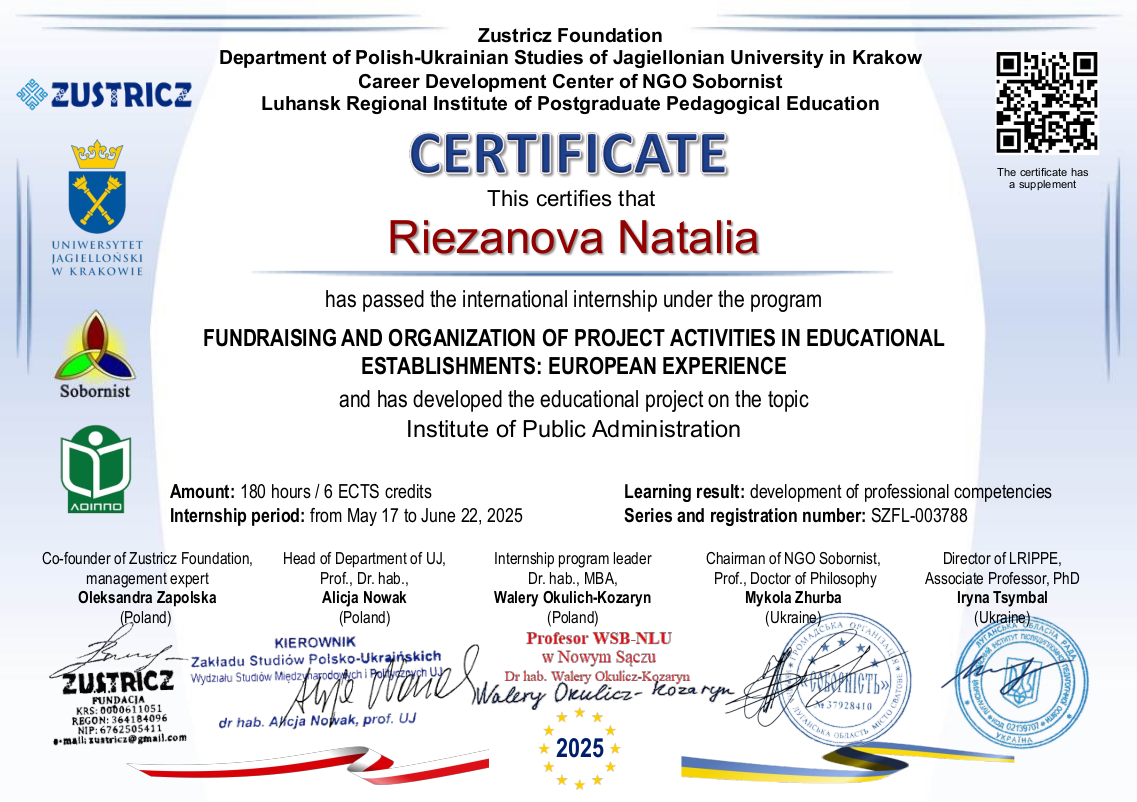 Професор кафедри “Політологія та загальноправові дисципліни”, доктор політичних наук, професор Олена ПОСТОЛ та доцент кафедри “Політологія та загальноправові дисципліни”, кандидат філософських наук, доцент Наталія РЄЗАНОВА з 17 травня по 22 червня 2025 року пройшли міжнародне стажування за програмою підвищення кваліфікації на тему “Фандрейзинг та організація проєктної діяльності в закладах освіти: європейський досвід” (180 годин/6 кредитів ЄКТС). Організатори – кафедра Польсько-Українських студій Ягеллонського університету (Республіка Польща); Центр розвитку кар'єри ГО “Соборність” (Україна).