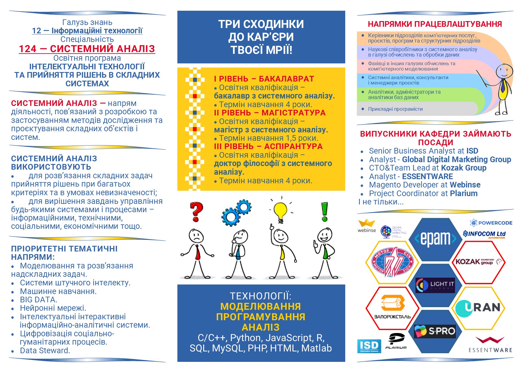 Системний аналітик – одна з новітніх професій, що базується на ІТ-технологіях та математичному моделюванні. Однією з основних переваг фахівців з системного аналізу є універсальність підготовки, завдяки якій майбутні випускники здатні вирішувати проблеми і завдання високого рівня в будь-яких сферах діяльності людини. Фахівці з системного аналізу спираються на комплекс загальнонаукових, експериментальних, природничих, статистичних, математичних методів і застосовують системний підхід при аналізі та вирішенні проблем в складних технічних, економічних, екологічних системах. Спостерігається стійке зростання попиту на фахівців, що володіють сучасними технологіями аналізу даних, а Гарвардський бізнес-огляд визначив професіонала в галузі аналізу даних як «найпривабливішу роботу 21-го століття».