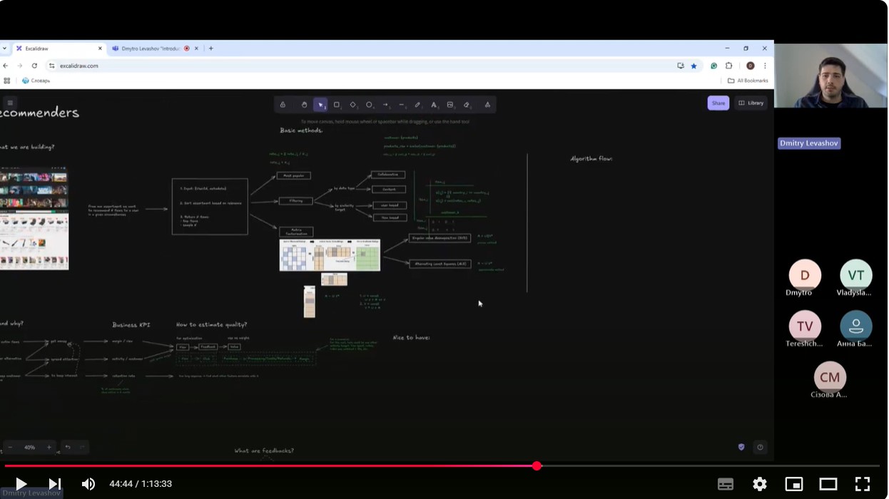 Дмитро пояснив, що системи рекомендацій використовують дані про взаємодію користувачів із товарами чи контентом (явні оцінки і неявні дії типу кліків) для передбачення їхніх вподобань. Було показано, як формулюється задача побудови матриці взаємодії та які метрики (MAE, RMSE, Precision/Recall) допомагають оцінити якість рекомендацій. Розглянули базові підходи: фільтрацію за контентом, колаборативну фільтрацію (на основі схожості користувачів або предметів) і методи матричної факторизації. Наприкінці згадали про проблему «розрідженості» даних і упередженість на популярні об’єкти, а також коротко окреслили шляхи їхнього подолання.