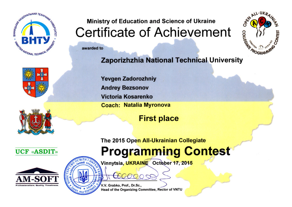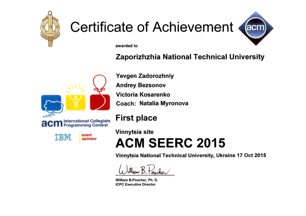 виступила відмінно, посівши I абсолютне місце в підсумковій таблиці півфіналу світу студентської олімпіади з програмування ACM по Південно-Східній Європі та вперше отримала право представляти Запорізький національний технічний університет (ЗНТУ) у фіналі Міжнародної студентської олімпіади з програмування АСМ, який відбудеться у Таїланді в травні 2016 року.