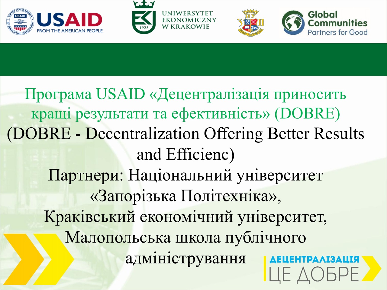 1. Програма Агентства США з міжнародного розвитку (USAID) «Децентралізація приносить кращі результати та ефективність» (DOBRE), яка виконується Глобал Ком'юнітіз, у співпраці із Малопольською школою державного управління при Краківському університеті економіки (MSAP/UEK), Польща.