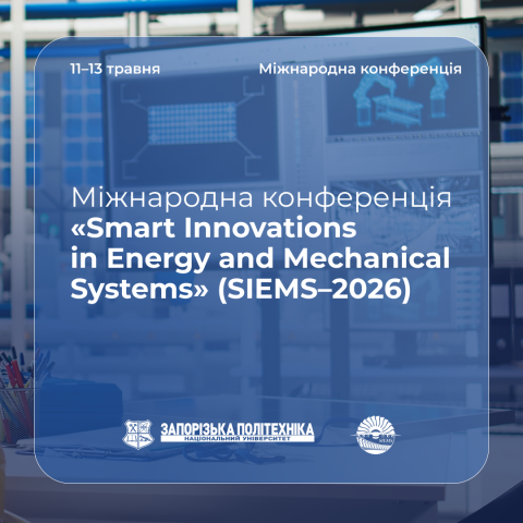 Запрошуємо всіх охочих взяти участь у Міжнародній конференції «Smart Innovations in Energy and Mechanical Systems» (SIEMS–2026), яку проводитиме НУ «Запорізька політехніка» за підтримки Кардіффського університету (Велика Британія), Штутгартського університету (Німеччина), Гданського технологічного університету (Польща), Оффенбурзького університету прикладних наук (Німеччина), GPMS International Inc (США), АТ «Івченко-Прогрес», АТ «Мотор Січ»!