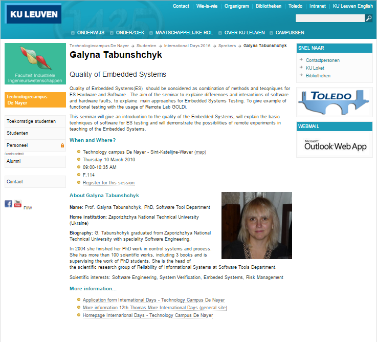 Професор кафедри програмних засобів ЗНТУ Табунщик Галина Володимирівна в рамках індивідуальної мобільності програми Erasmus+ KA1 за запрошенням професора Тон Гудеме (Prof. Toon Goedeme) провела семінари для магістрів з електроніки та магістрів з інформаційних технологій KU Leuven з дисципліни «Якість інформаційних систем» та охопила теми «Робота з системами контроля версій», «Функціональне тестування вбудованих систем за використанням віддаленої лабораторії», «Модельно-орієнтоване тестування вбудованих систем». В рамках міжнародних днів зробила доповідь щодо потенціалу ЗНТУ для міжнародного співробітництва та використання віддаленої лабораторії GOLDi для навчання з дисципліни «Якість вбудованих систем».