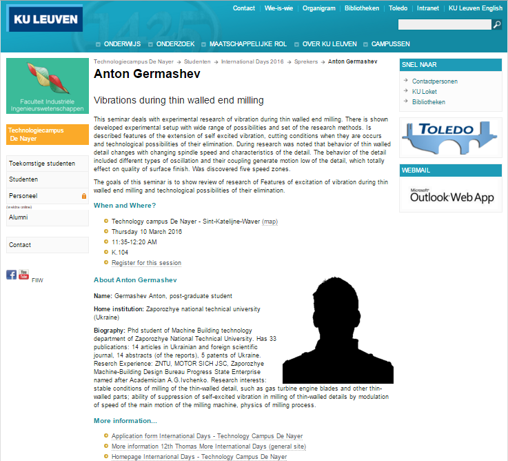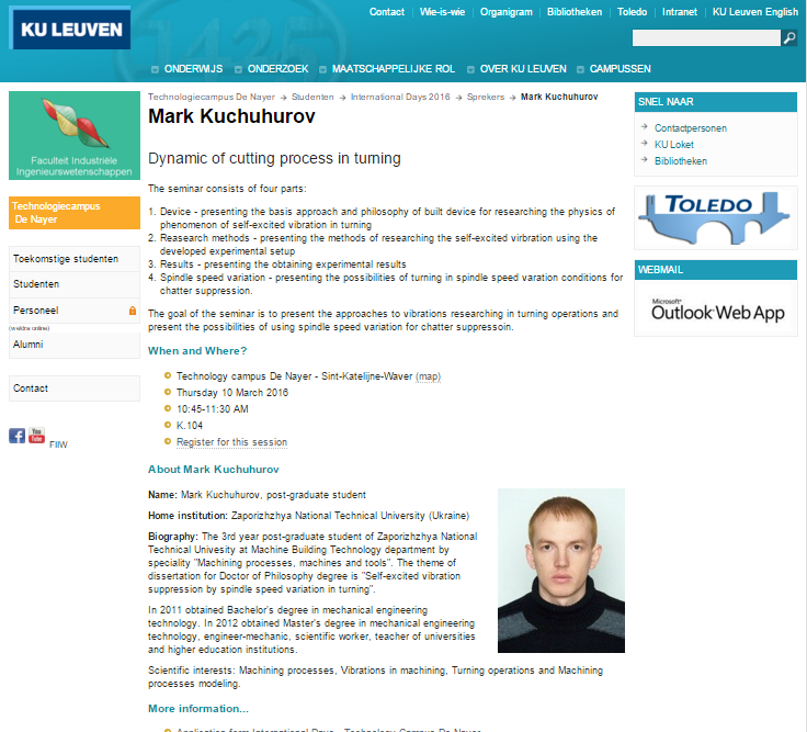 Аспіранти ЗНТУ, які зараз знаходяться на стажуванні в KU Leuven за програмою Erasmus+ KA1, також провели семінари в рамках міжнародних днів: Марк Кучугуров (наук. кер. Внуков Ю.М. ) зробив доповідь на тему «Dynamics of the cutting process in turning», а Антон Гермашев (наук. кер. Внуков Ю.М. ) зробив доповідь на тему «Vibrations during thin walled end milling».