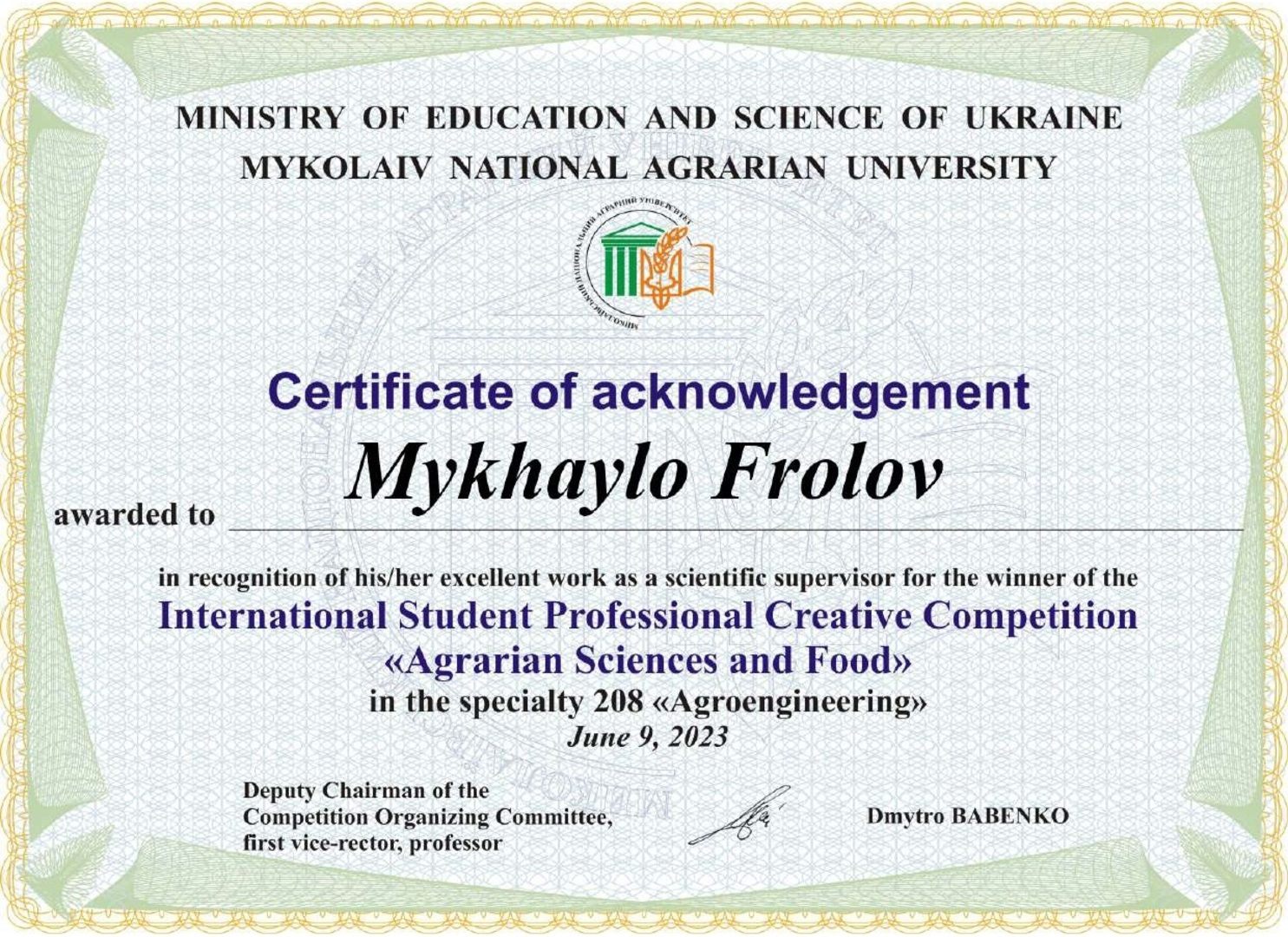 Ігор під науковим керівництвом завідувача кафедри металорізальних верстатів та інструментів Михайла Фролова вийшов на етап підсумкової науково-практичної конференції та здобув перемогу за напрямом «Агроінженерія». Конкурсний проєкт був підготовлений спільно з колегами з Миколаївського національного аграрного університету.