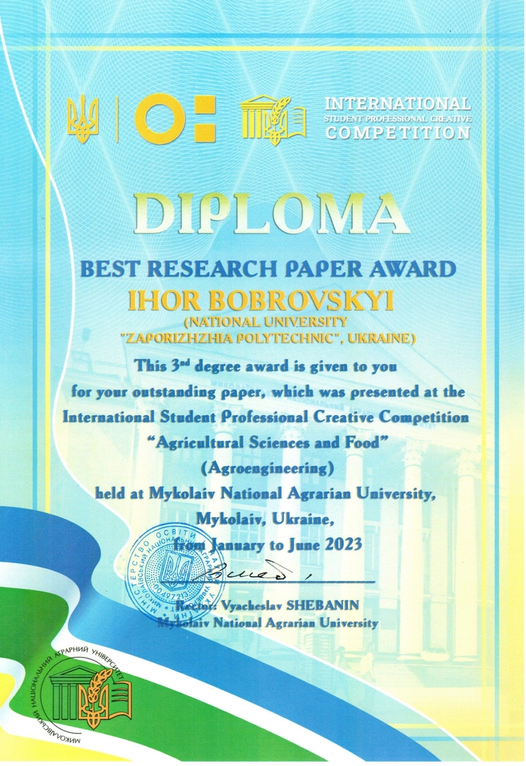 За підсумками Міжнародного студентського професійного творчого конкурсу «Аграрні науки та продовольство» студент Запорізької політехніки Ігор Бобровський відзначений дипломом III ступеня!