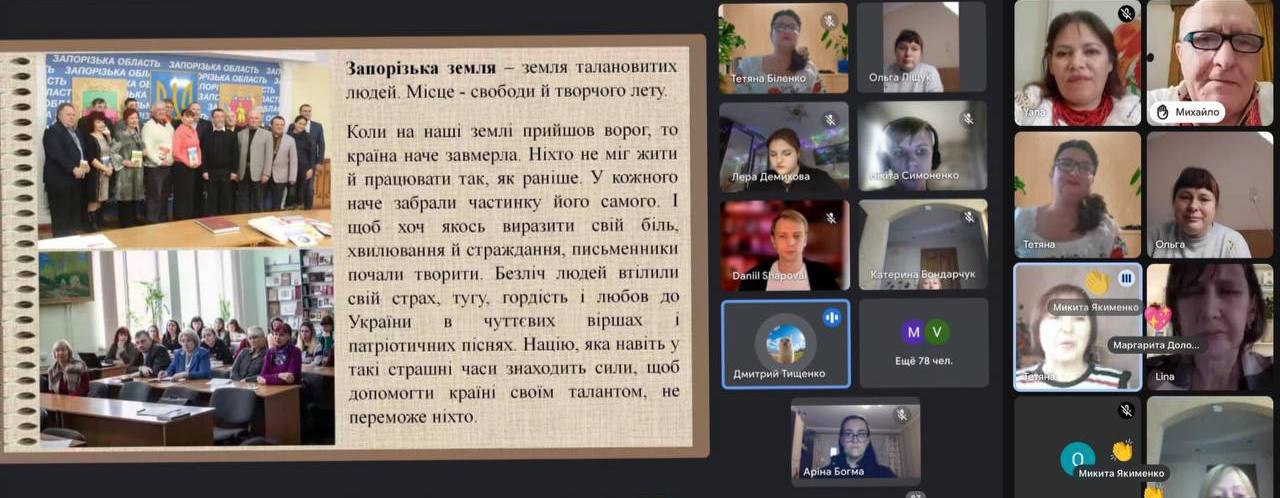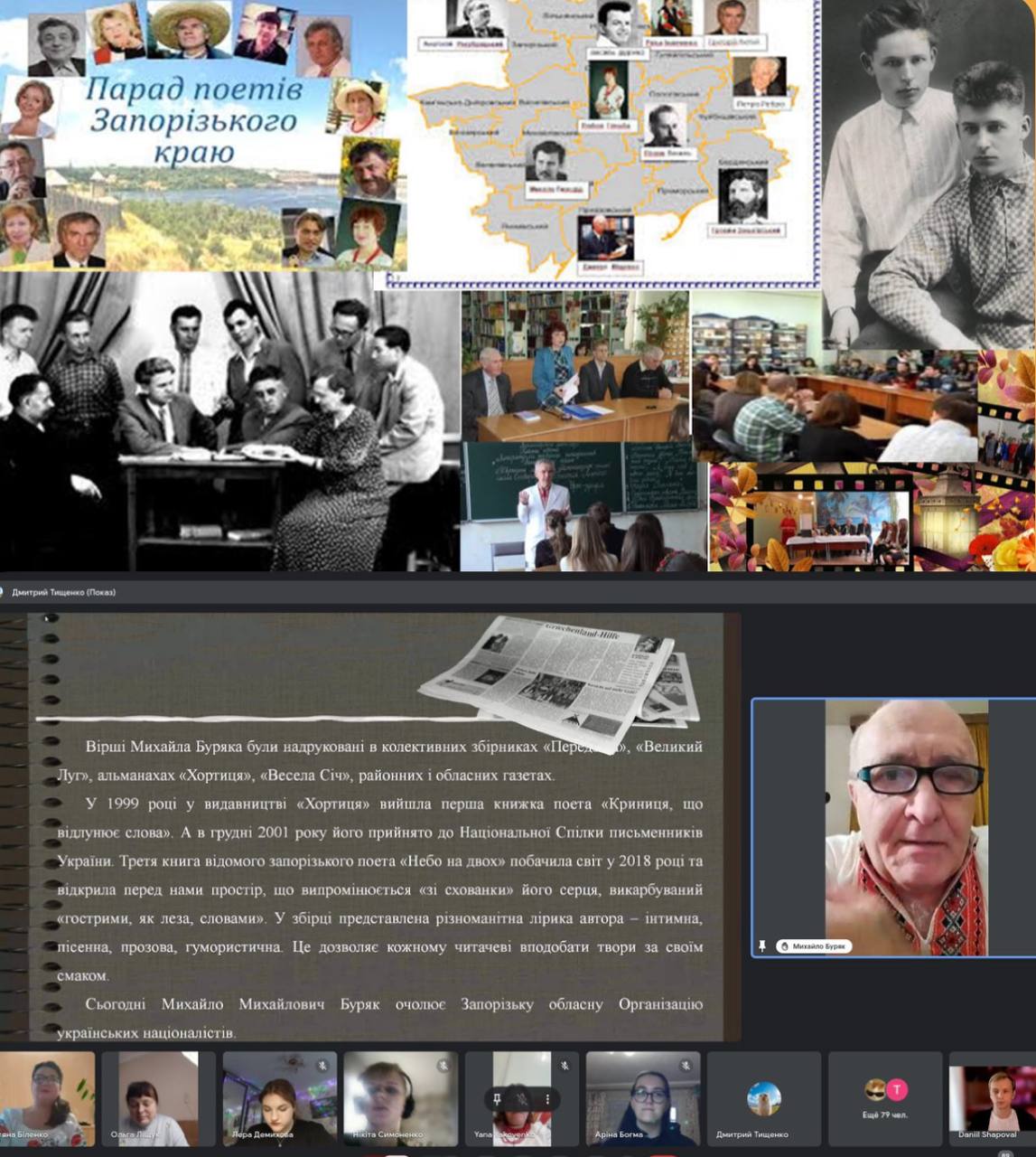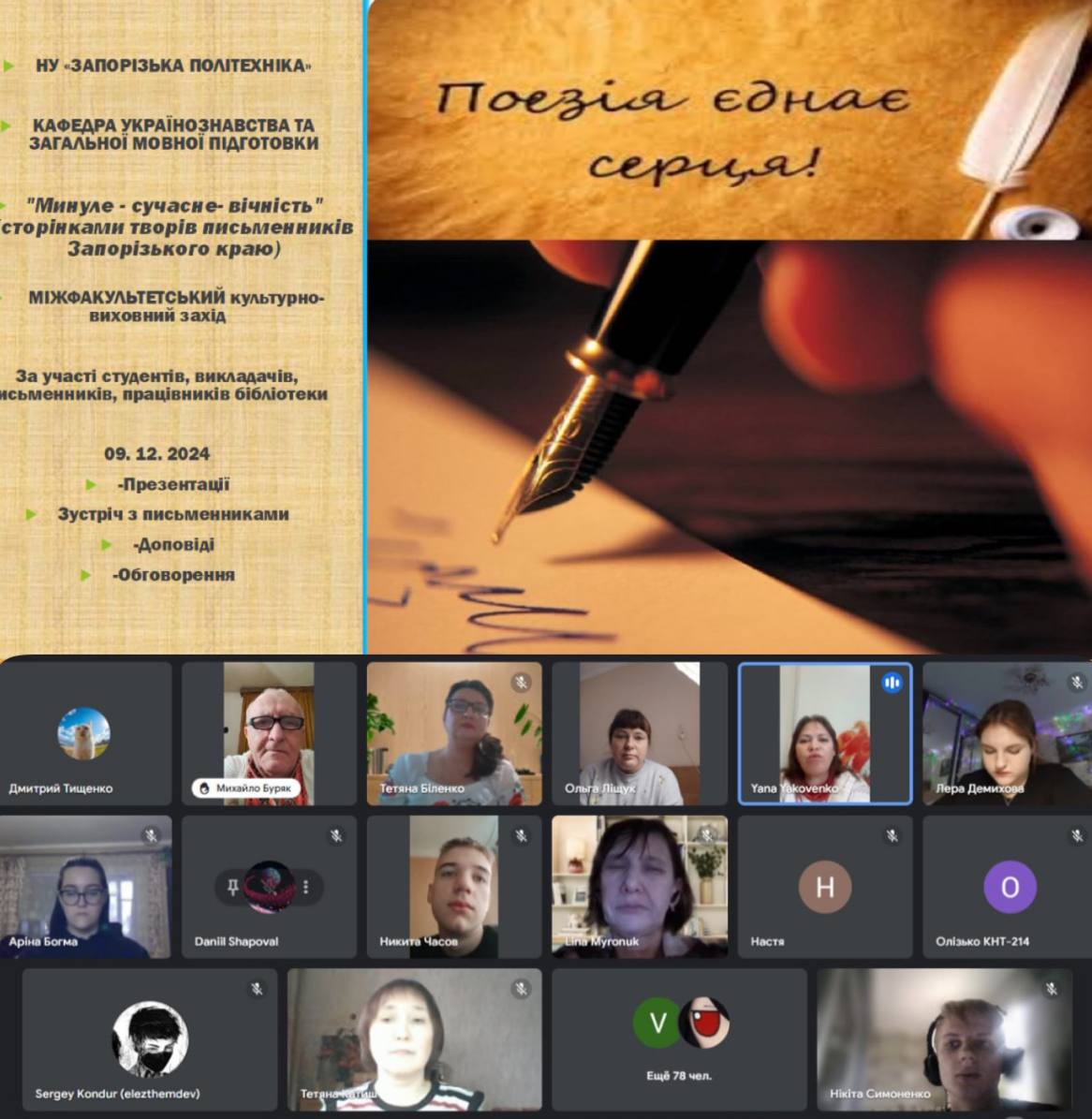 Поезія варта того, щоб бути постійною супутницею в нашому житті, надихати, підтримувати, навчати та любити. Саме знайомству з поетичною творчістю митців Запорізького краю був присвячений міжфакультетський культурно-виховний захід «Минуле — сучасне — вічність: сторінками творів письменників Запорізького краю», який відбувся 9 грудня. Долучилися до обговорення в онлайн-режимі близько 100 учасників.