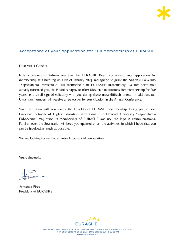 Незважаючи на складні часи, «Запорізька політехніка» не зупиняється та продовжує розвиватися на міжнародному рівні. Новий рік розпочався з того, що наш університет став повноправним членом Європейської асоціації закладів вищої освіти (англ. European Association of Institutions in Higher Education, EURASHE).