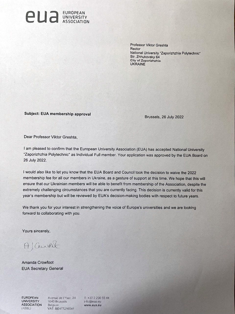 Вітаємо колектив та студентство університету з цією подією, адже вступ до лав асоціації відкриває для НУ «Запорізька політехніка» ще більше нових перспектив в європейському освітньому просторі.