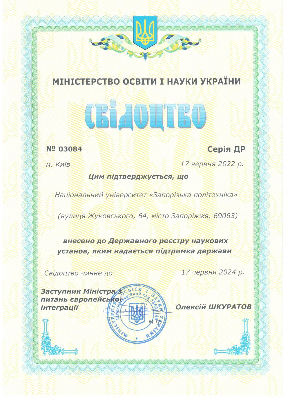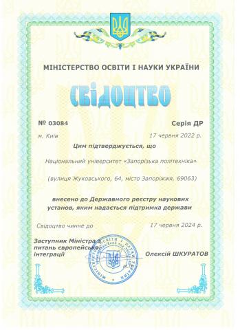 За результатами атестації було підготовлено і ми отримали Свідоцтво про внесення до реєстру наукових установ, яким надається підтримка держави № 03084, Серія ДР. Чинне до 17.06.2024р.