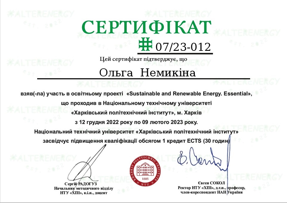 Nemуkina O.V. Renewable and alternative energy sources: Tutorial with parallel text /O.V. Nemykina, А.V. Blyzniakov – Zaporizhzhia: Zaporizhzhia PolytechnicNational University Publishing House, 2021 – 353 p. ISBN 978-617-529-308-9