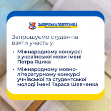 Ми запрошуємо студентів усіх курсів взяти участь у Міжнародному конкурсі з української мови імені Петра Яцика та Міжнародному мовно-літературному конкурсі учнівської та студентської молоді імені Тараса Шевченка.