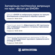 Психологічна служба НУ «Запорізька політехніка» запрошує усіх охочих відвідати безплатний курс «Вступ до EMDR». Курс проводиться у межах відкритого психологічного лекторію Запорізької політехніки.