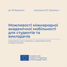 У рамках Програми ЄС Еразмус+ за напрямом КА1: Навчальна (академічна) мобільність для українських закладів вищої освіти відкриті можливості для співпраці з європейськими університетами задля організації взаємного обміну студентами, викладачами за проєктами з міжнародної кредитної мобільності.