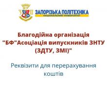Продовжуємо підтримувати наших військових, територіальну оборону та тих, хто звертається до нас за допомогою. Знаємо, що тисячі наших випускників за межами нашої країни також прагнуть допомагати, тим самим наближаючи нашу спільну перемогу, і це підтверджують їх численні звернення! Благодійна організація «Благодійний фонд «Асоціація випускників ЗНТУ (ЗДТУ, ЗМІ) запрошує випускників Національного університету «Запорізька політехніка» та усіх бажаючих долучитися до збору коштів, що будуть витрачені на потреби захисту, оборони та відновлення.