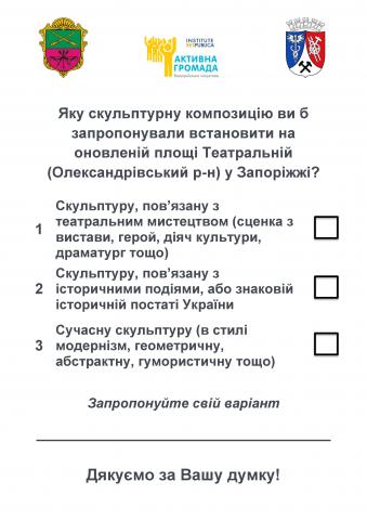 Яку скульптурну композицію ви б запропонували встановити на оновленій площі Театральній (Олександрівський р-н) у Запоріжжі?