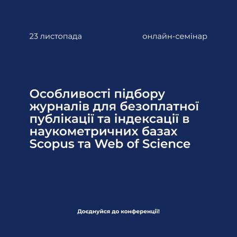 З метою покращення публікаційної активності співробітників НУ «Запорізька політехніка» в іноземних наукових періодичних виданнях, що індексуються в Scopus та Web of Science, наукова бібліотека спільно з науково-дослідною частиною 23 листопада о 14:00 проводить онлайн-семінар: «Особливості підбору журналів для безоплатної публікації та індексації в наукометричних базах Scopus та Web of Science».