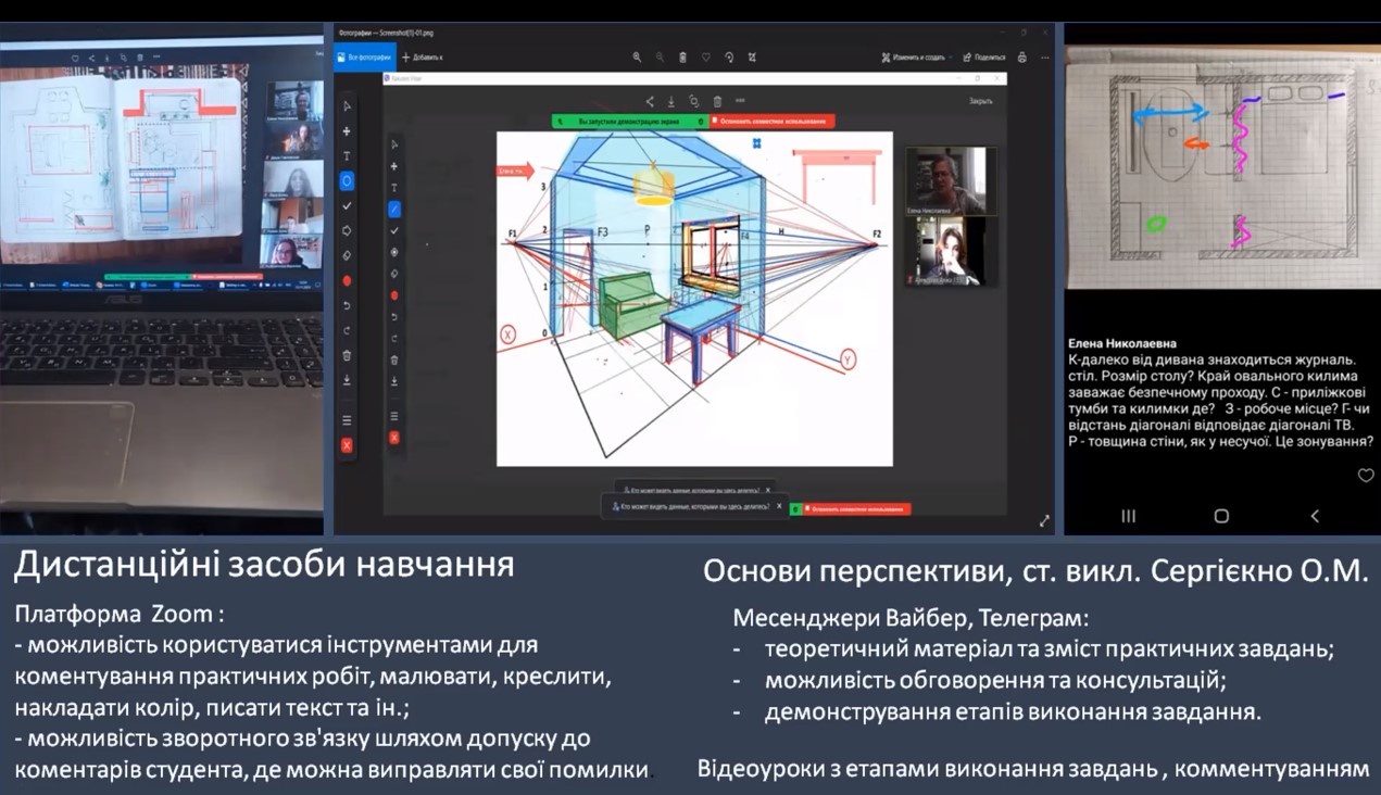 На семінарі було обговорено методики викладання дисциплін за спеціальністю 022 «Дизайн» в режимах онлайн та офлайн та способи набуття студентами необхідних навичок та компетентностей. Напрацьовано методики проведення конкурсів. Учасники семінару також поділились практичним досвідом роботи з програмним забезпеченням, яке використовують кафедри для проведення онлайн-занять.