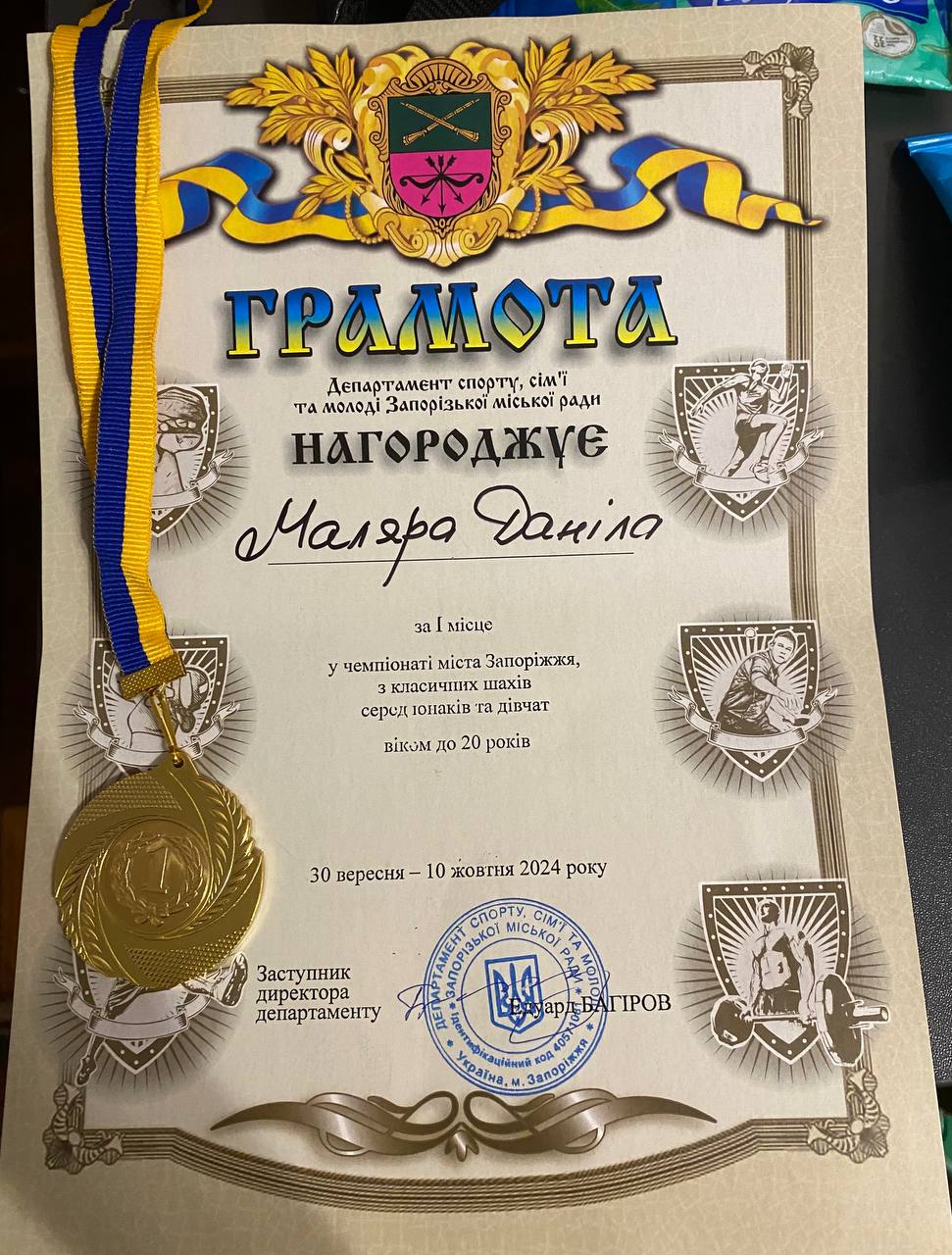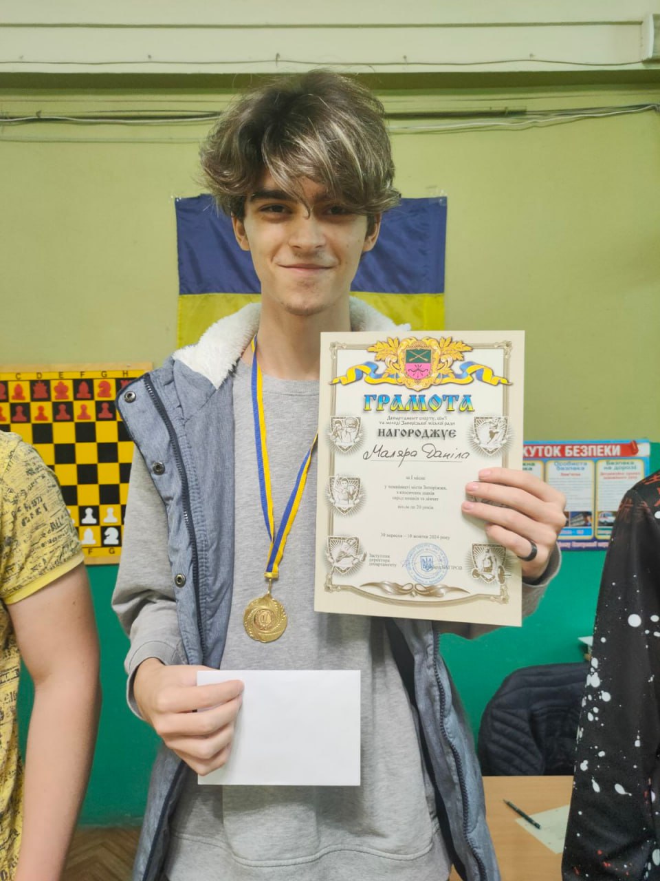 Вітаємо нашого студента другого курсу Маляра Даніла (група СН–123, ОПП «Психологія») з перемогою — першим місцем у чемпіонаті міста Запоріжжя з класичних шахів серед юнаків та дівчат віком до 20 років!