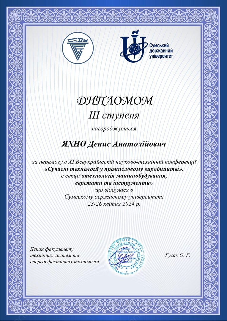 3-го ступеня — Денис Яхно, аспірант кафедри технології машинобудування, керівник — завідувач кафедри Сергій Дядя