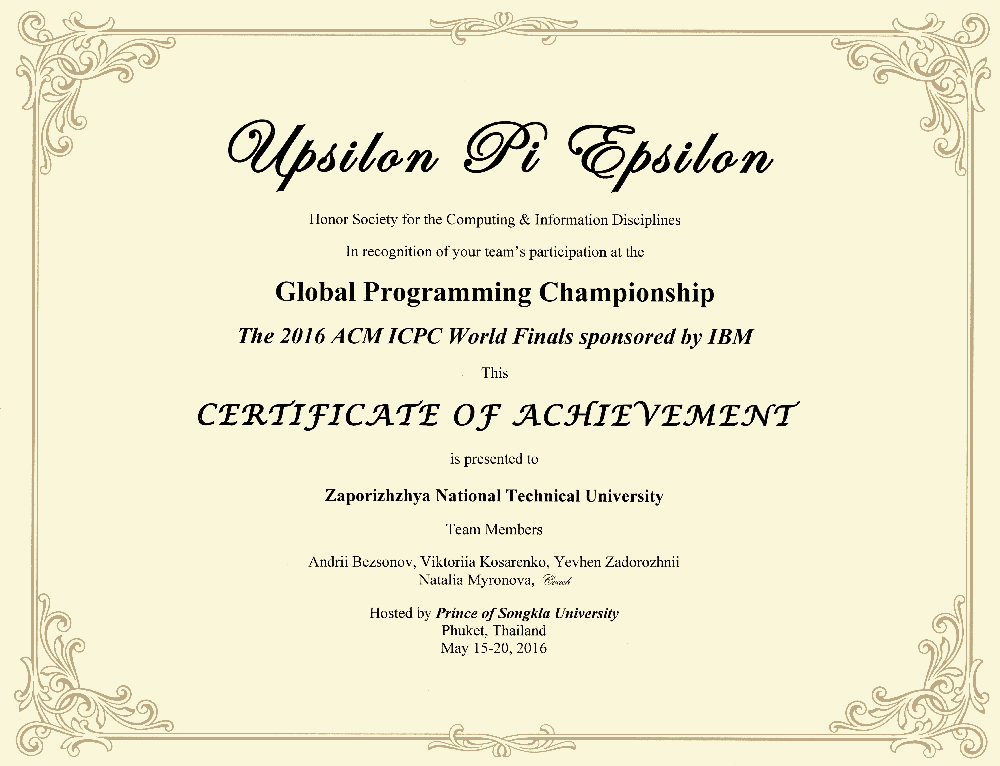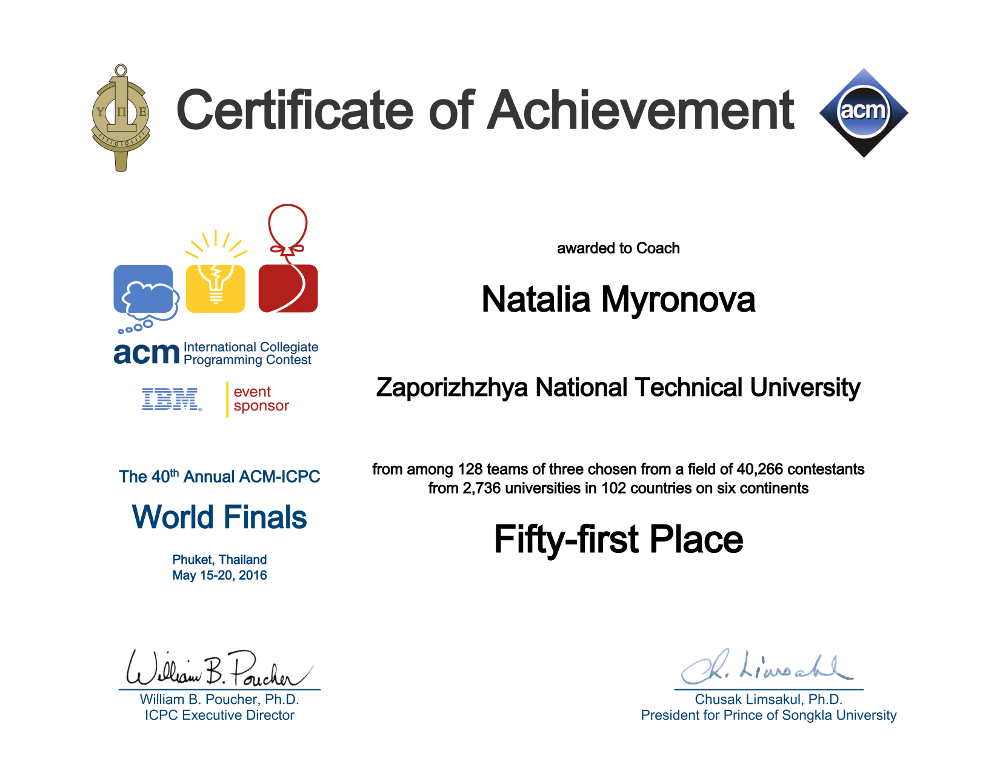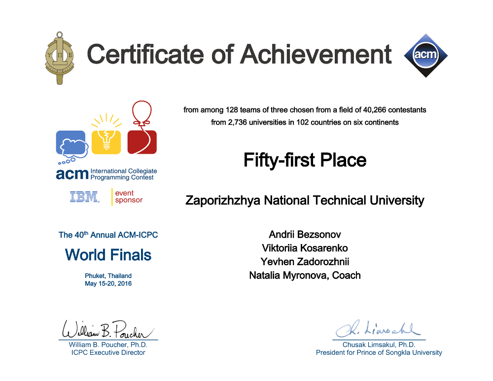 З 15 травня по 20 травня 2016 року відбувся фінал Міжнародної студентської олімпіади з програмування ACM у м. Пхукет, Королівство Таїланд на базі Prince of Songkla University.